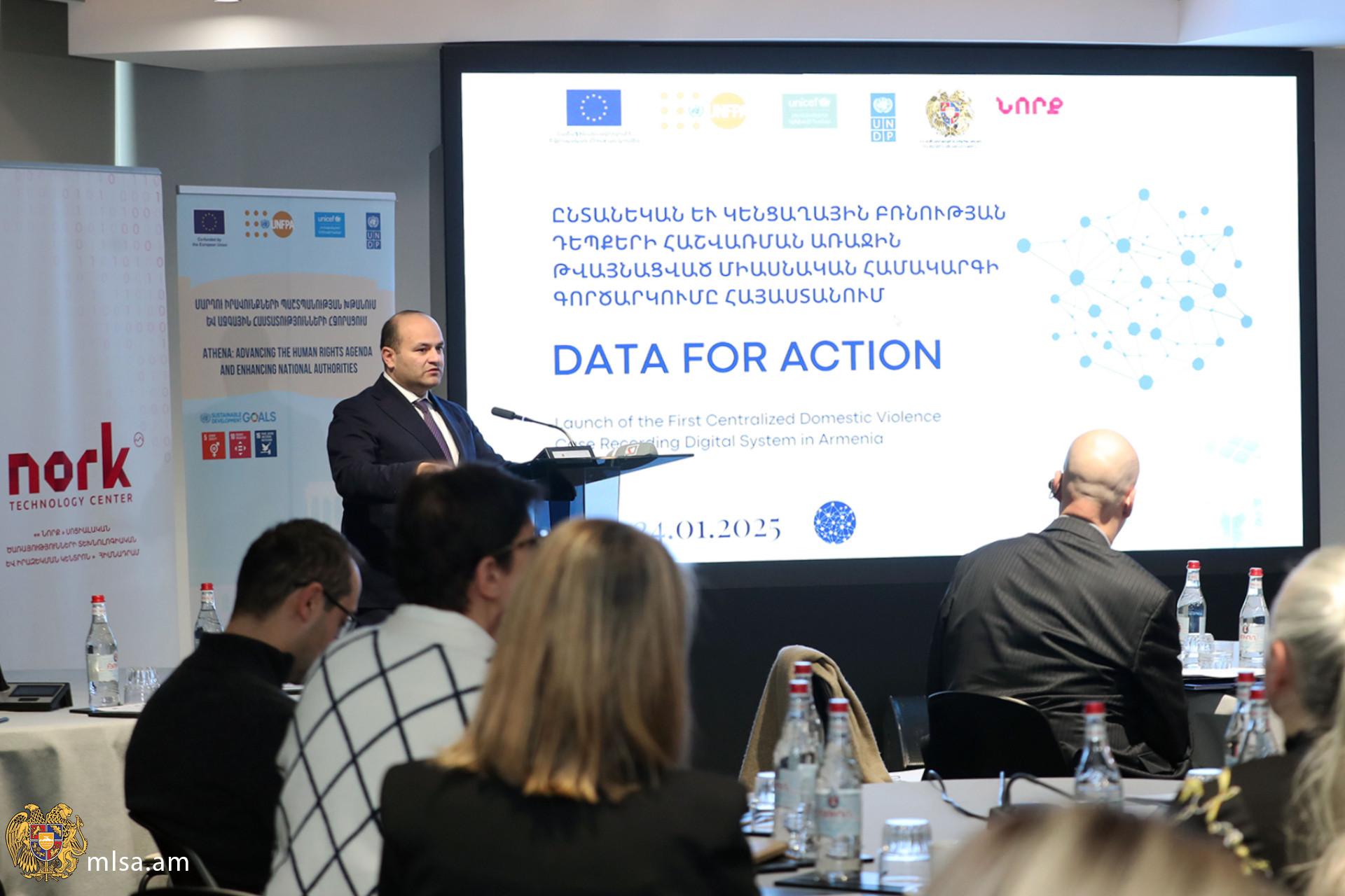 «Այսօրինակ համակարգերը հնարավորություն են տալիս պետական մարմիններին մշակել փաստարկված և տվյալների վրա հիմնված քաղաքականություններ՝ ուղղված ընտանիքում բռնության կանխարգելմանը և հաղթահարմանը, ընտանեկան բռնության ենթարկված անձանց պաշտպանության և աջակցության միջոցների արդիականացմանն ու բարելավմանն ու վերջապես հանրության իրազեկվածության բարձրացմանը։ Համակարգի առկայությունը կարևոր է նաև բռնության դեպքերի դինամիկան վերահսկելու, կրկնվող դեպքերն ու ռիսկային գործոնները վերհանելու և համապատասխան կանխարգելիչ գործողություններ իրականացնելու համատեքստում»,- իր ողջույնի խոսքում նշել է նախարար Մկրտչյանը։