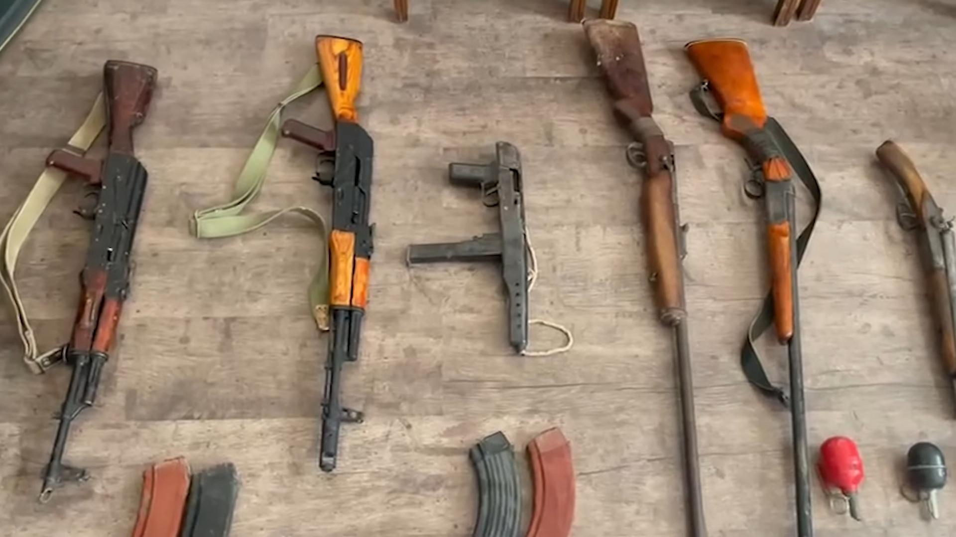 «Նախաձեռնված քրեական վարույթի շրջանակում կատարված զննությամբ նշված վայրում հայտնաբերվել է՝ «Կալաշնիկովի» 2 ինքնաձիգ, «Մաուզեր» ինքնաձիգ, տարբեր տեսակի հրացաններ, «Գլոկ» ատրճանակ, «Բայկալ» ատրճանակ, «G1» տիպի 4 նռնակ, «Ֆ1» տիպի նռնակ, նռնակի 8 պայթուցիչ, 2 հակատանկային ական, մոտ 5 մետր դետոնացիոն լար, զինվորական կապի սարքավորում, մեկնարկային ատրճանակի լուսաձայնային 5 փամփուշտ, ինքնաձիգի 4 փամփշտատուփ, որոնցից 2-ը՝ ամբողջությամբ լիցքավորված և ինքնաձիգի 730 փամփուշտ։