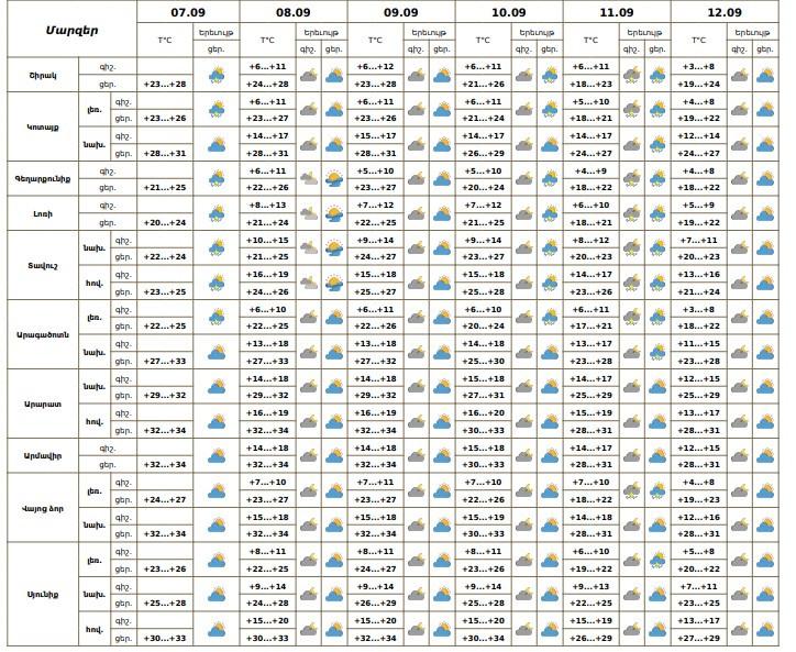 Սեպտեմբերի 7-ին և 10-ին կեսօրից հետո, 11-ի գիշերը և կեսօրից հետո առանձին շրջաններում սպասվում է կարճատև անձրև և ամպրոպ։ Սեպտեմբերի 8-9-ին, 12-ին սպասվում է առանց տեղումների եղանակ: Քամին՝ արևմտյան՝ 2-5մ/վ, ամպրոպի ժամանակ սպասվում է քամու ուժգնացում՝ 17-20մ/վ արագությամբ։ Օդի ջերմաստիճանը սեպտեմբերի 7-ի ցերեկը, 8-ին Լոռիում և Տավուշում աստիճանաբար կնվազի՝ 2-4 աստիճանով, մնացած շրջաններում էապես չի փոխվի: