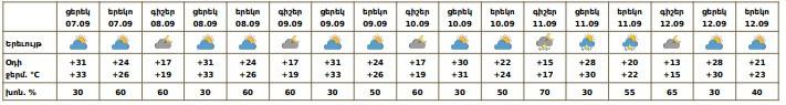 Սեպտեմբերի 7-ի ցերեկը, 8-10-ին, 12-ին սպասվում է առանց տեղումների եղանակ։ Սեպտեմբերի 11-ի գիշերը և կեսօրից հետո սպասվում է կարճատև անձրև և ամպրոպ։ Սպասվում է քամու ուժգնացում՝ ամպրոպի ժամանակ 16-19մ/վ, երեկոյան ժամերին՝ 13-16 մ/վ արագությամբ: