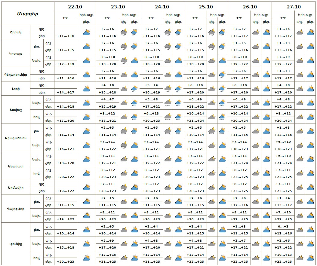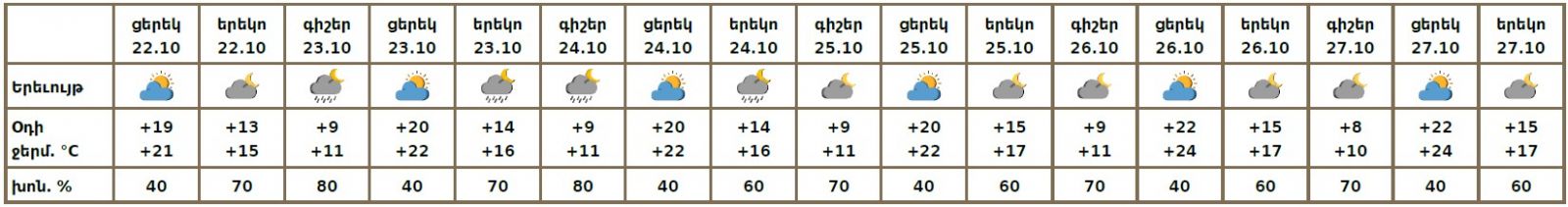Քամին արևմտյան՝ 2-5մ/վ: Օդի ջերմաստիճանը հոկտեմբերի 22-ի ցերեկը, 23-ին կբարձրանա 3-5 աստիճանով։