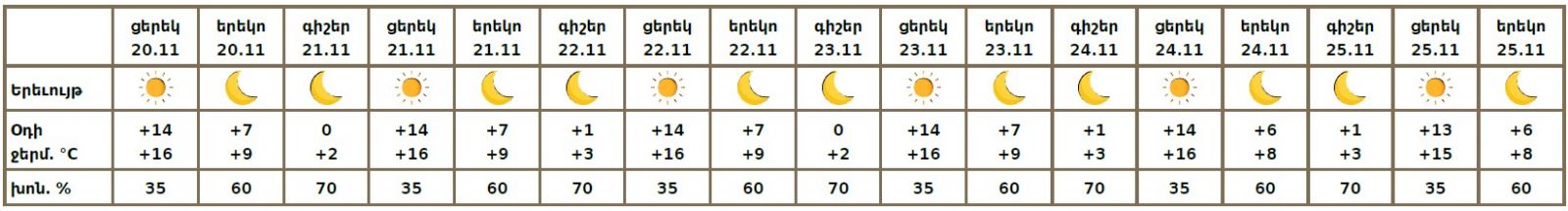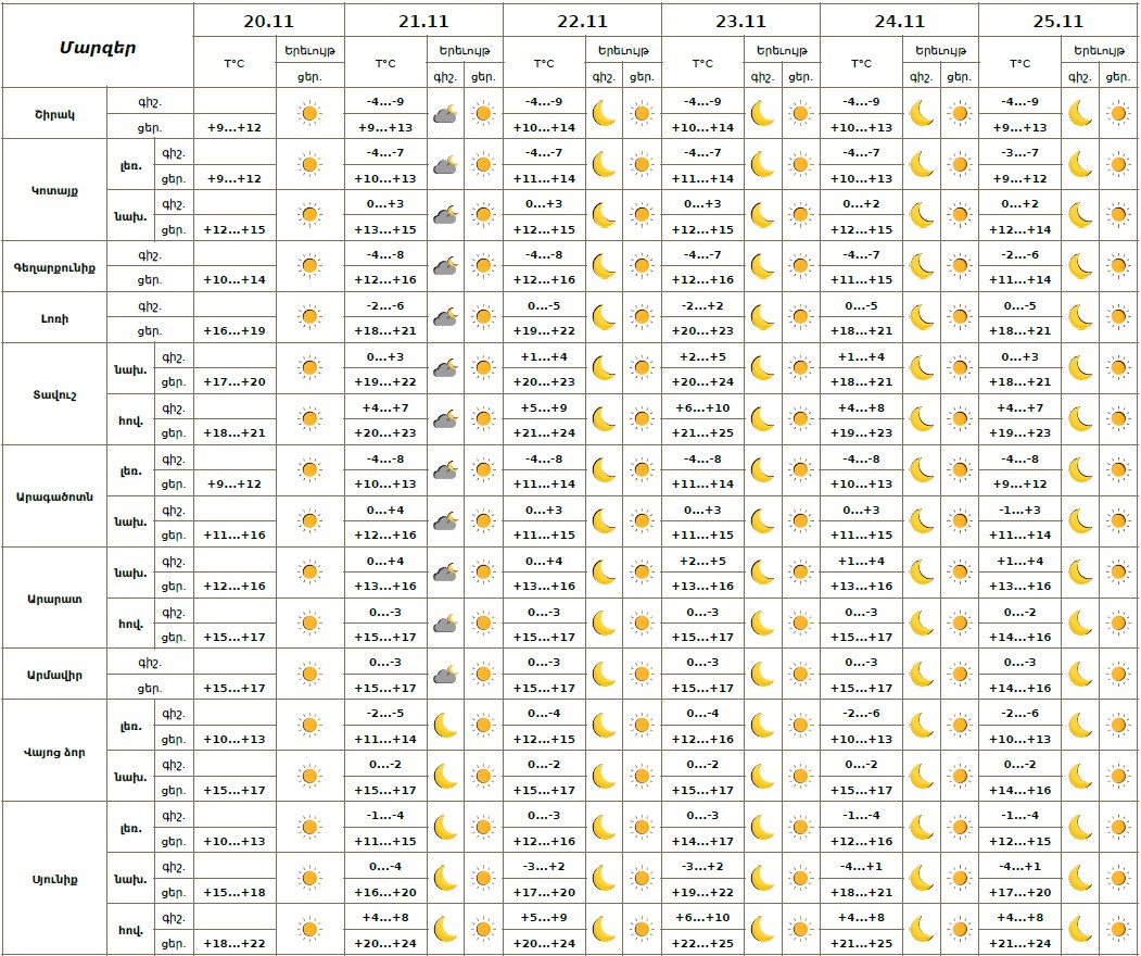 Նոյեմբերի 20-ի ցերեկը, 21-25-ին սպասվում է առանց տեղումների եղանակ։