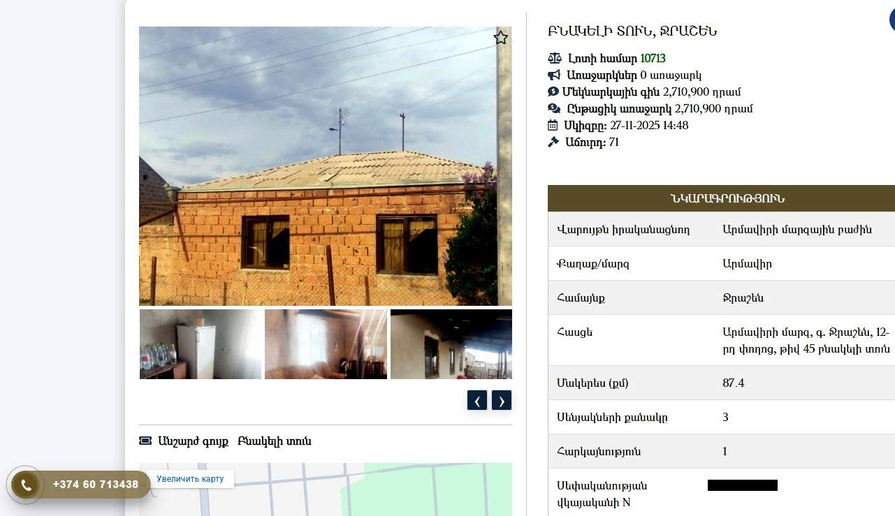 Նշված անշարժ գույքը 11.850.000 դրամ մեկնարկային արժեքով, հարկադիր էլեկտրոնային աճուրդի է ներկայացվել 2022թ. սեպտեմբերի 8-ին՝ դեռևս 2015թ. սեպտեմբերի 10-ին հարուցված կատարողական վարույթի շրջանակներում, և տվյալ պահին ընթանում է լոտի 71-րդ աճուրդը: