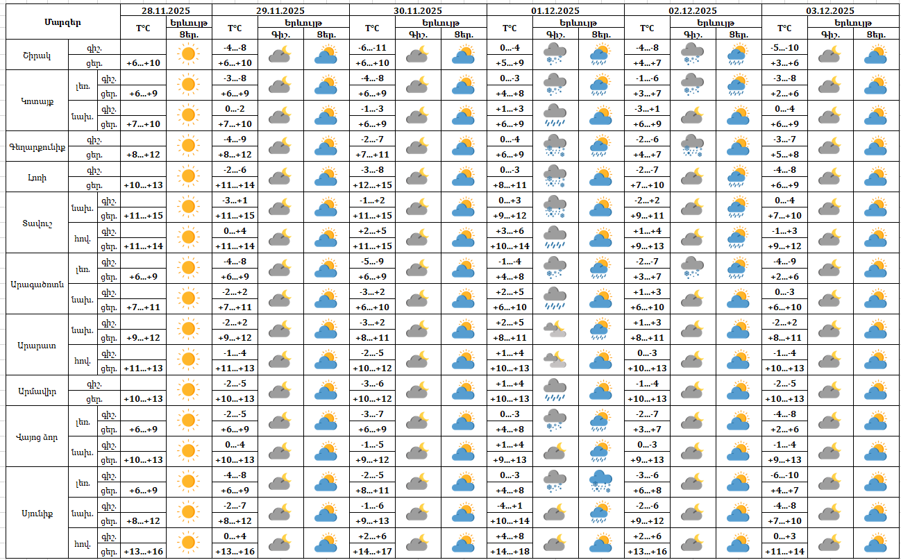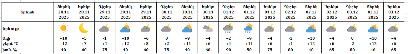 «Հայհիդրոմետը» հաղորդում է, որ նոյեմբերի 28-ի ցերեկը, 29-30-ին, դեկտեմբերի 3-ին հանրապետության տարածքում սպասվում է առանց տեղումների եղանակ։ Նոյեմբերի 29-ի և 30-ի լուսադեմին Արարատյան և Շիրակի դաշտում սպասվում է կարճատև մառախուղ:
