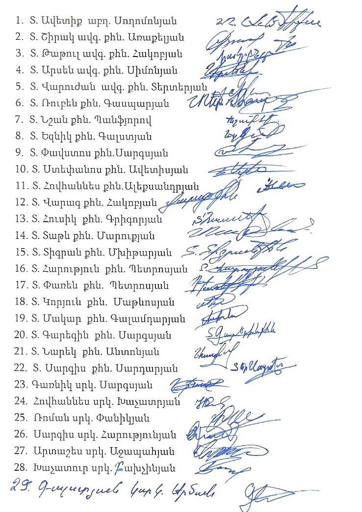 «Մենք՝ ներքոստորագրյալներս՝ Շիրակի թեմի հոգևորականաց դասը, հայտարարում ենք, որ հիմա և միշտ, մեր կոչումին վայել, անշեղորեն կանոնական Սուրբ Պատարագ ենք մատուցելու և, մեր հավատարմությամբ առ Միածնաէջ Սուրբ Էջմիածին և նրա օրինավոր գահակալ՝ Ն.Ս.Օ.Տ.Տ. Գարեգին Բ Սրբազնագույն Կաթողիկոս, հիշատակելու ենք մեր Հայրապետի և թեմակալ առաջնորդ Բարձրաշնորհ Տ. Միքայել Արք. Աջապահյանի անունները: