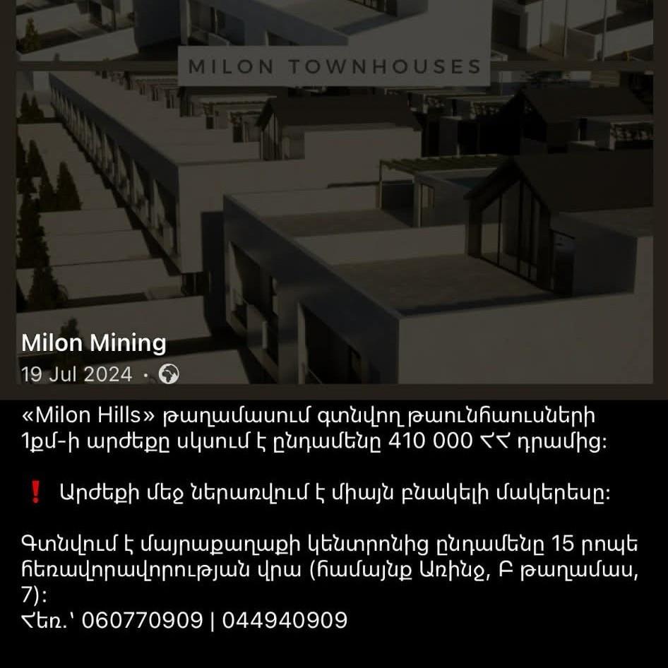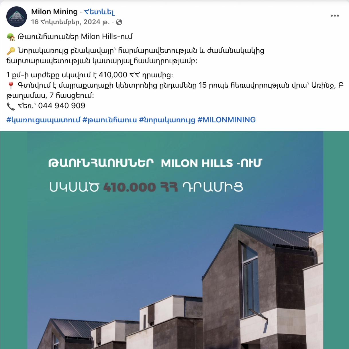 «Միլոն մայնինգ» ՍՊԸ-ի ֆեյսբուքյան էջում նշված է, որ բնակելի տների 1 քմ-ն վաճառվում է սկսած 420 հազար դրամից։