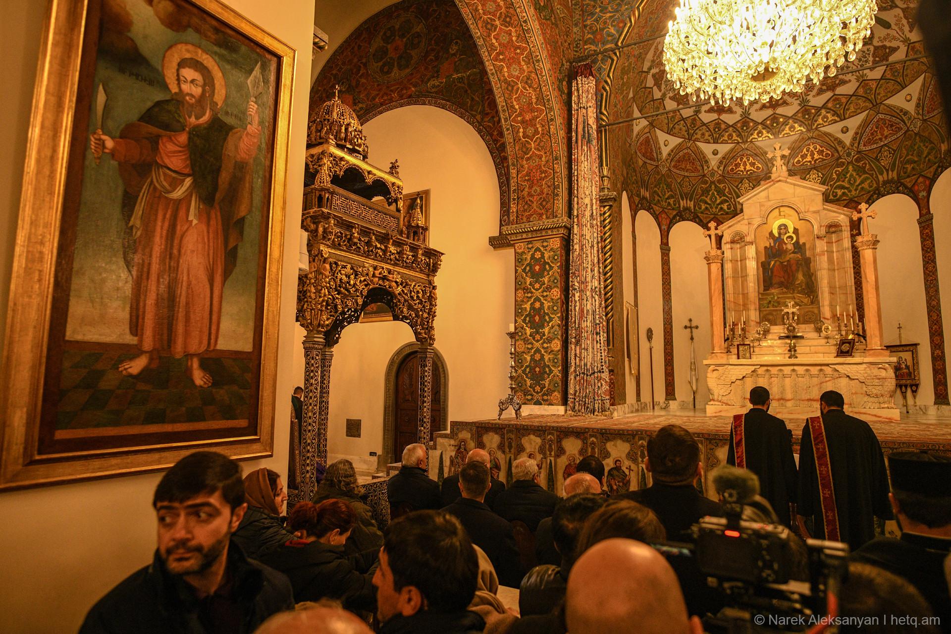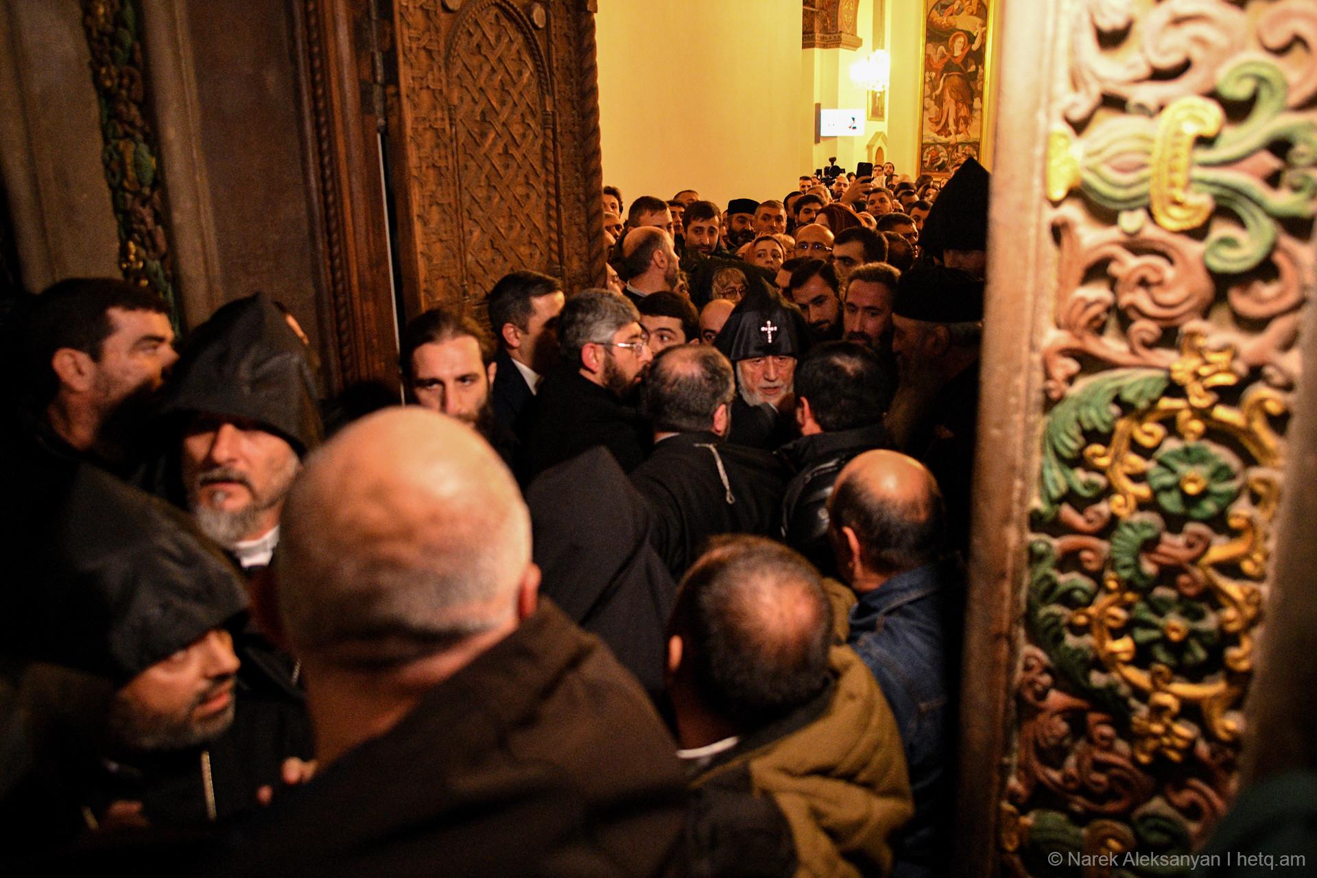 Եկեղեցու բակում հավաքվել էր Վեհափառին աջակցություն հայտնելու եկած ժողովուրդը, իսկ բակի մյուս թևում հավաքվել էին վերջինիս հեռանալը պահանջող քաղաքացիներ։ Նրանց բաժանում էր ոստիկանական պատնեշը։ Ժամերգությունը սկսեուց որոշ ժամանակ անց Վեհափառի հեռանալը վանկարկող քաղաքացիները փորձեցին ներխուժել եկեղեցու ներս, սկսվեց հրմշտոց։ Որոշ ժամանակ անց Կաթողիկոս Գարեգին Բ-ն դուրս եկավ եկեղեցուց և ուղևորվեց դեպի Վեհարան։