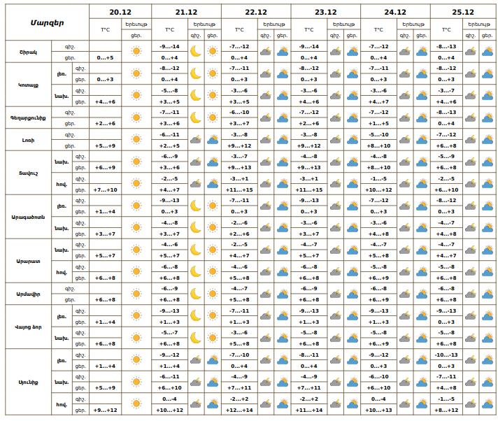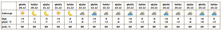 Դեկտեմբերի 20-ի ցերեկը, 21-25-ին սպասվում է առանց տեղումների եղանակ։ Քամին հյուսիսային՝ 2-5մ/վ, դեկտեմբերի 22-23-ին սպասվում է քամու ուժգնացում՝ 14-17 մ/վ արագությամբ։ Օդի ջերմաստիճանն էապես չի փոխվի։