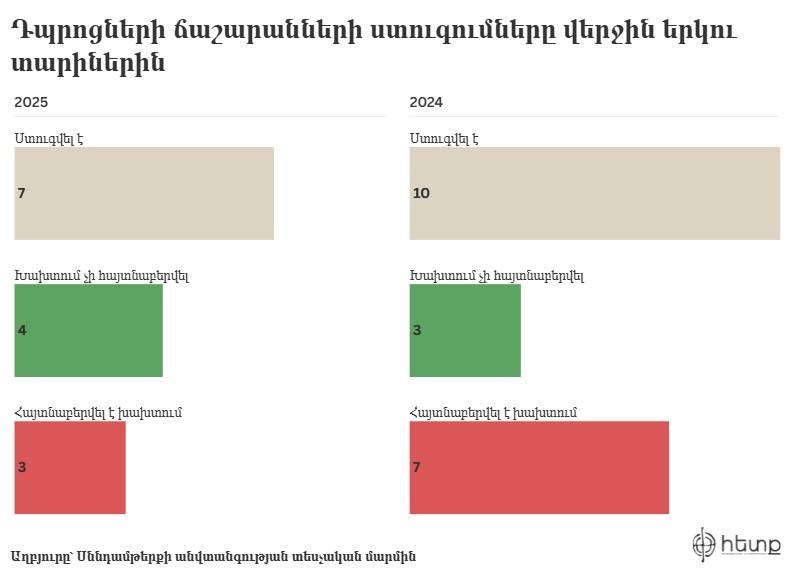 2025 թվականին (դեկտեմբերի 18-ի դրությամբ) Հայաստանի դպրոցների ճաշարաններում Սննդի անվտանգության տեսչական մարմինը իրականացրել է ընդամենը 7 ստուգում։ Նախորդ տարի ՍԱՏՄ-ն իրականացրել էր 10 ստուգում։