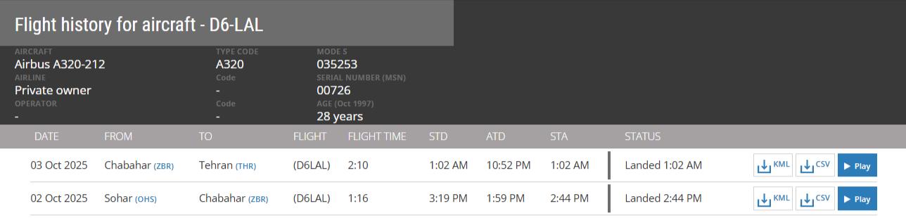 Planespotters.net-ի փոխանցմամբ՝ օգոստոսի 2-ից մինչեւ հոկտեմբերի 2-ն օդանավը կանգնած էր Օմանի Սոհարի օդանավակայանում: Հոկտեմբերի 2-ին այն թռել է Իրանի ուղղությամբ: Ըստ flightaware.com-ի՝ D6-LEO-ն վերջին անգամ երեւացել է Իրանի Քեշմ կղզու երկնքում, սակայն թռիչքի տվյալները հուշում են, որ Քեշմի օդանավակայանը չի եղել դրա վերջնակետը: Ենթադրելի է, որ այս բորտը եւս հասել է «Մեհրաբադ»: