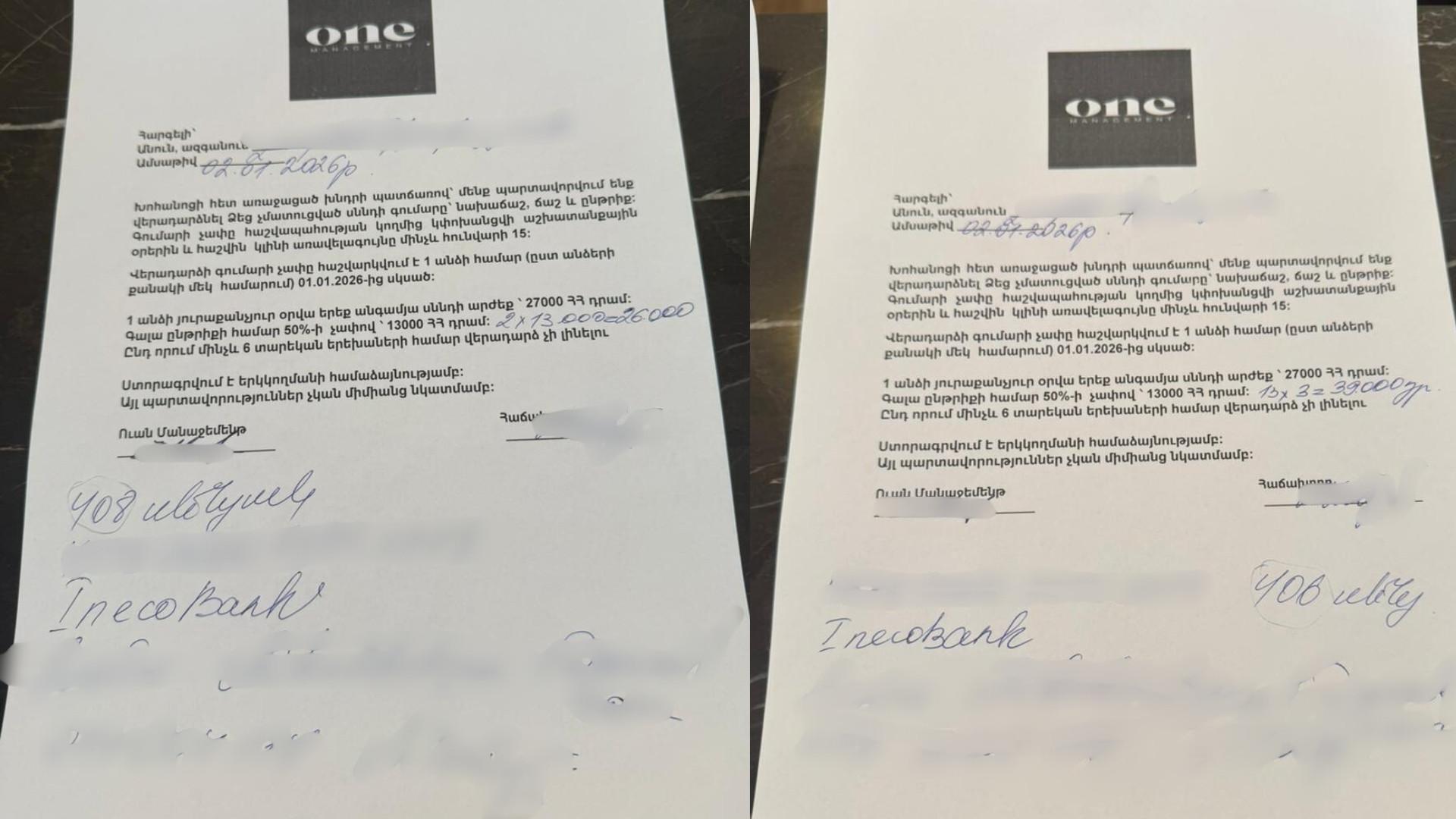 «Երկու օրվա սնունդ էին հաշվել, անձը՝ 27 000 դրամ, գալա ընթրիքը՝ մեկ անձի համար 26 հազար դրամ։ Բողոքելուց հետո գալա ընթրիքի միայն 50 տոկոսն էին պատրաստ վերադարձնել»,- նշում է նա։