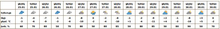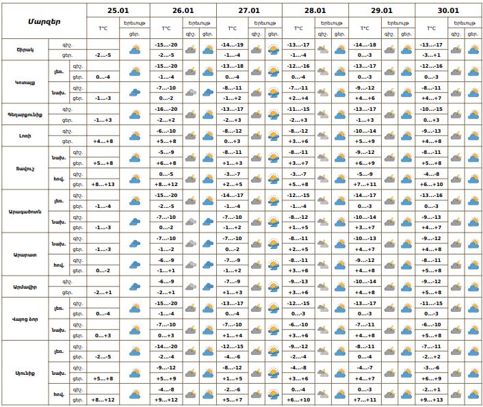 Հունվարի 25-ի ցերեկը, 26-30-ին սպասվում է առանց տեղումների եղանակ։ Քամին` հարավարևմտյան` 2-5մ/վ: Հունվարի 25-ի ցերեկը, 26-ին Շիրակի դաշտի ցածրադիր հատվածներում, Արագածոտնի նախալեռներում, Արարատյան դաշտում, այդ թվում նաև Երևանում սպասվում է մառախուղ։ Օդի ջերմաստիճանն էապես չի փոխվի: