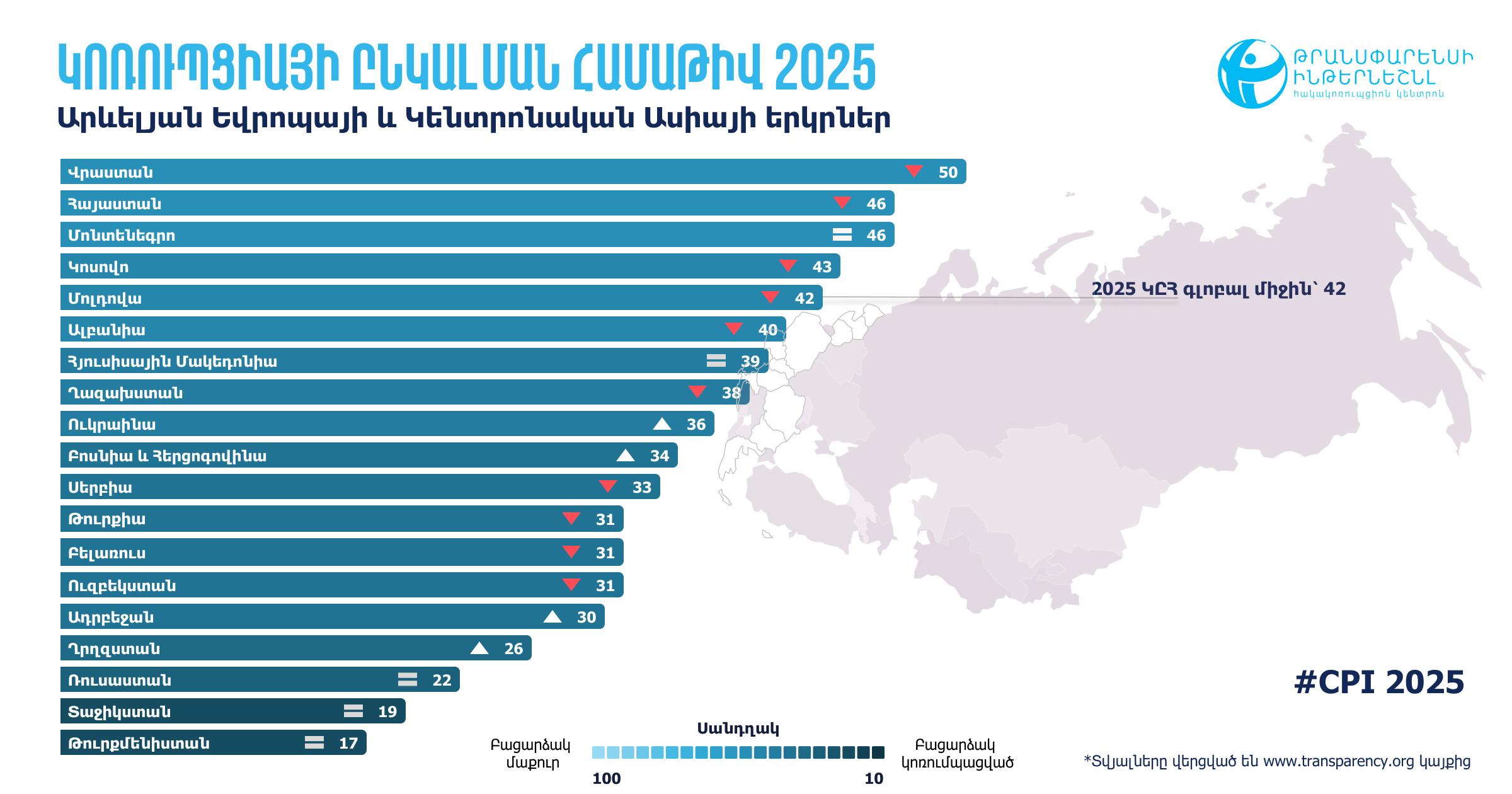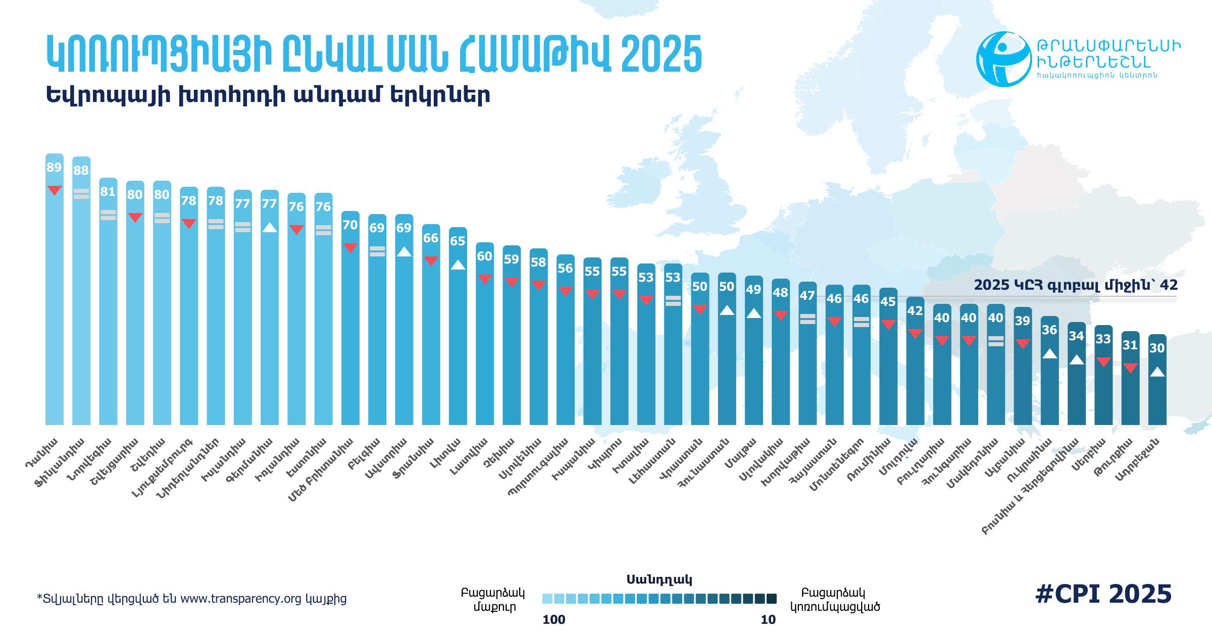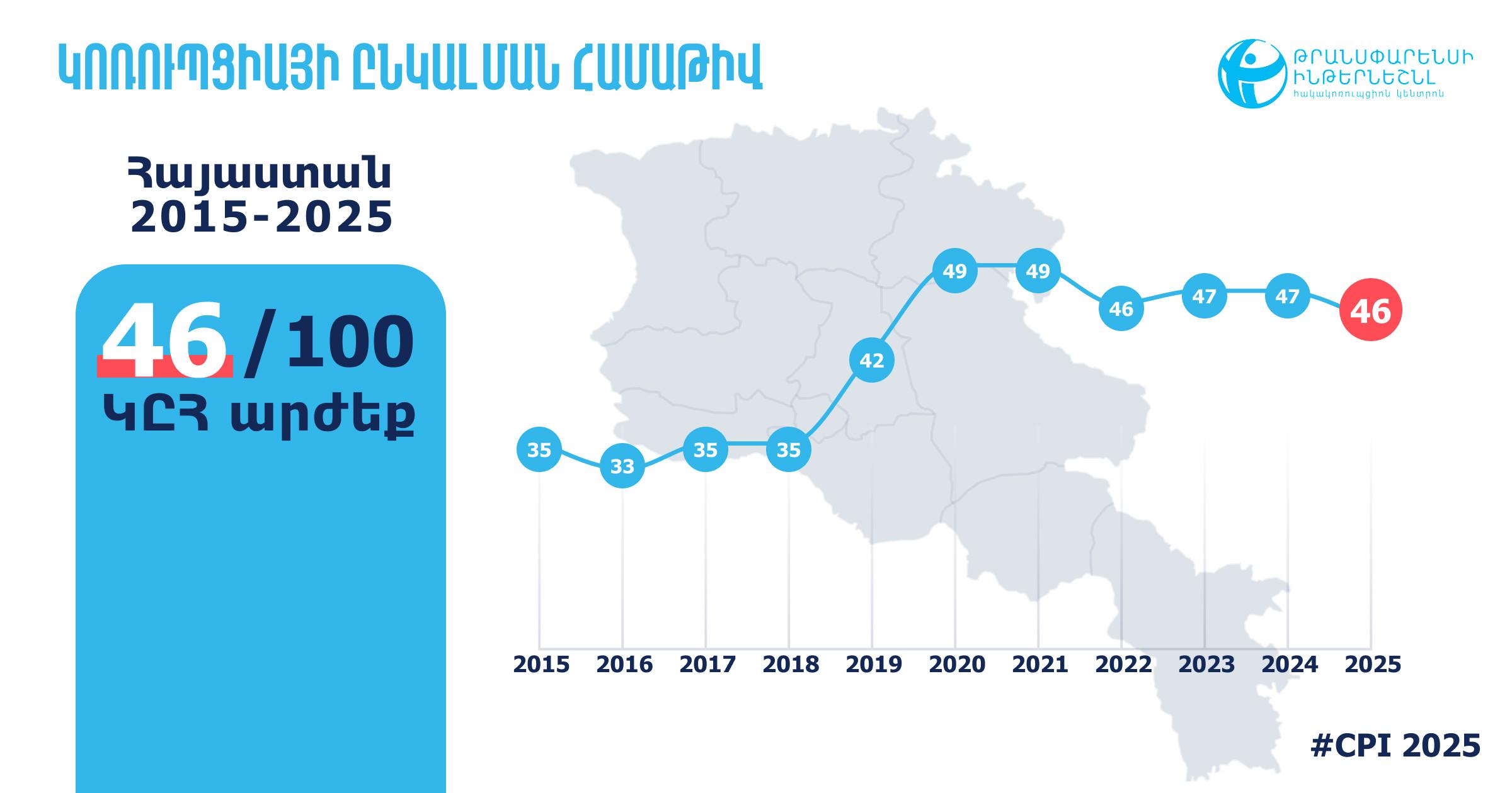 Հայաստանի ԿԸՀ 2025թ. արժեքը նախորդ տարվա համեմատ նվազել է մեկ միավորով՝ իջնելով 46 միավոր՝ 0-ից (բացարձակապես կոռումպացված) 100 (բացարձակապես մաքուր) սանդղակի վրա։ 2025թ. 182 երկիր ներառող ԿԸՀ դասակարգման աղյուսակում Հայաստանը Քուվեյթի, Մոնտենեգրոյի (Չեռնոգորիա), Նամիբիայի և Սենեգալի հետ կիսում է 65-69-րդ տեղերը (2024 թ.-ին Հայաստանը կիսում էր 63-64-րդ տեղերը 180 երկրների շարքում):