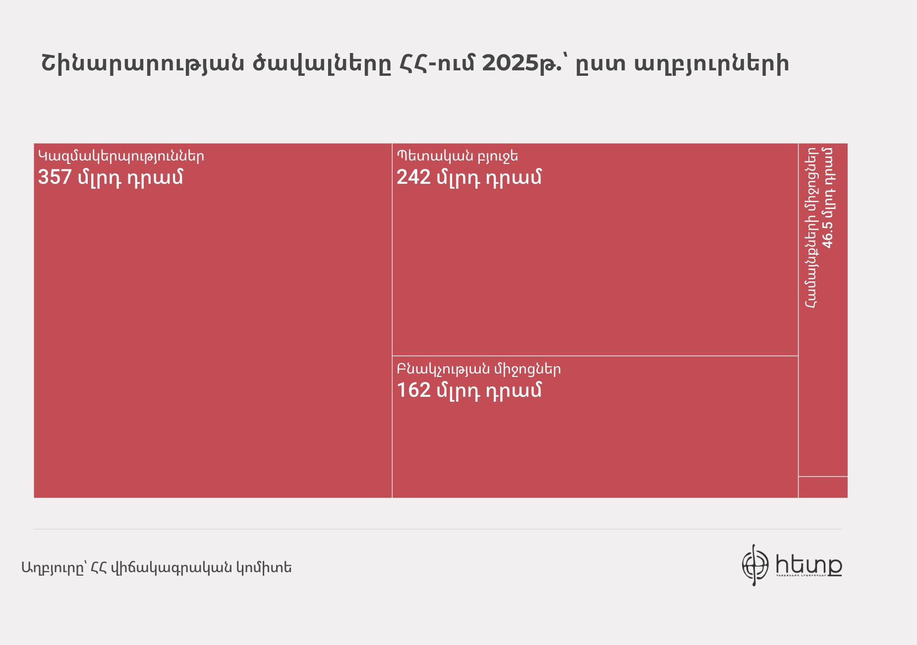 Վիճակագրական կոմիտեի տվյալներով՝ 2025 թվականին 811 մլրդ դրամի շինարարության 44%-ը՝ 357 մլրդ դրամ, կազմակերպությունների միջոցներով է կատարվել։ Խոսքը հենց կառուցապատողների մասին է։