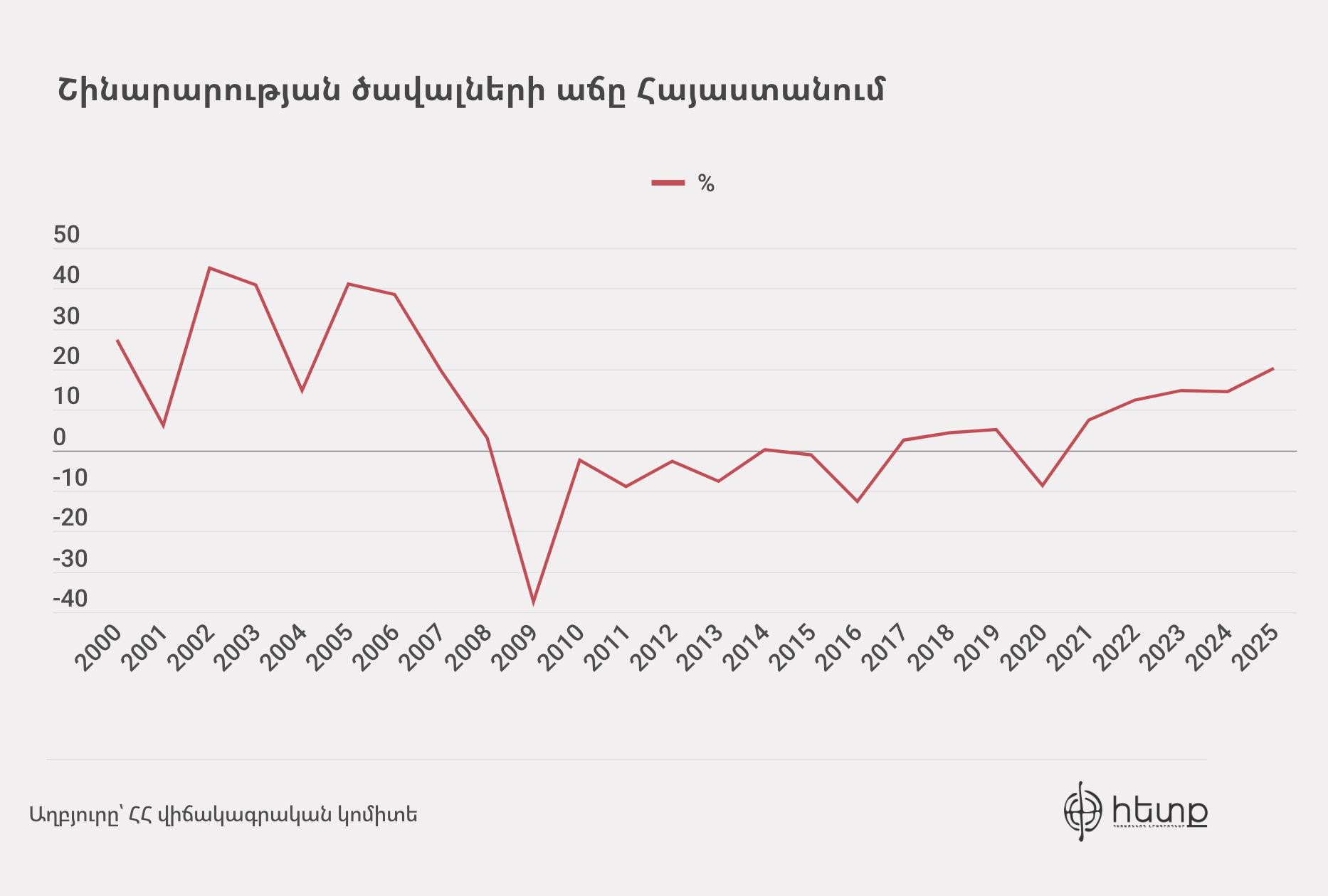 Կրկին համեմտության համար նշենք, որ օրինակ, 2024-ին պետական միջոցներով շինարարությունն աճել է 14.8%-ով, 2023-ին՝ 8%-ով, 2022-ին՝ 3%-ով։ Թեև աճի տեմպը այդ տարիներին որոշակի արագացել է, սակայն 2025-ի աճը թռիչքային է։