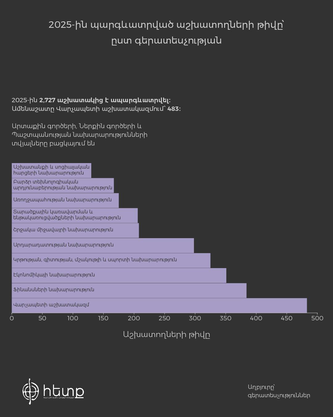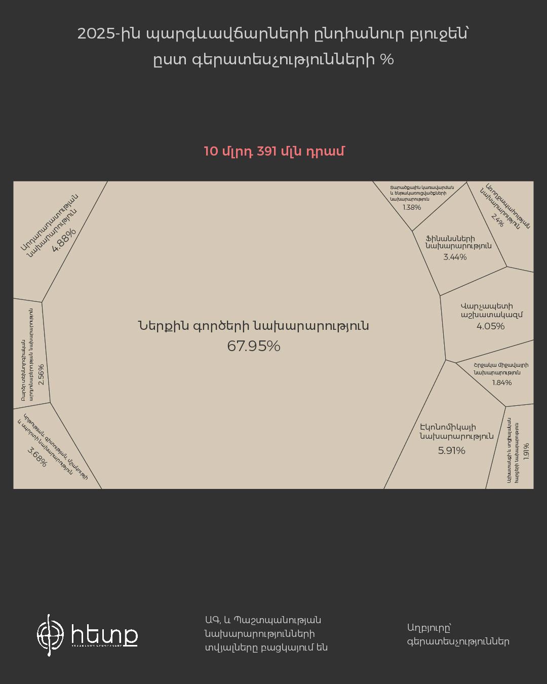 2025թ. պարգևավճարների ամենափոքր բյուջեն Տարածքային կառավարման և ենթակառուցվածքների նախարարությանն է. 206 աշխատողի պարգեւավճարների ֆոնդը կազմել է մոտ 143 մլն 666 հազ. դրամ, միջինը՝ մոտ 697 հազ. 400 դրամ: Թեև Աշխատանքի և սոցիալական հարցերի նախարարության պարգևատրված աշխատակիցներն ավելի քիչ են՝ 130 հոգի, սակայն ՏԿԵՆ-ից ավելի շատ պարգևավճար է տրվել՝ մոտ 198 մլն 478 հազ. դրամ: Ֆինանսների նախարարության 384 աշխատակից է պարգևատրվել՝ ընդհանուր 357 մլն 406 հազ. դրամ: ԿԳՄՍ նախարարության պարգևավճարների բյուջեն Ֆինանսների նախարարությունից մեծ է, թեեւ պարգեւատրվողների թիվն ավելի փոքր է՝ 325 հոգի և այլն: