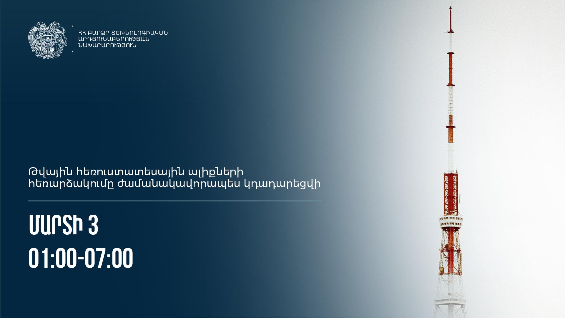 «Հայաստանի հեռուստատեսային և ռադիոհաղորդիչ ցանց» ընկերությունը տեղեկացնում է, որ մարտի 3-ին՝ ժամը 01։00-07։00-նընկած ժամանակահատվածում, թվային հեռուստատեսային հեռարձակման ցանցում նախատեսված պլանային պրոֆիլակտիկ աշխատանքներով պայմանավորված` հեռուստատեսային ալիքների հեռարձակումը ժամանակավորապես կդադարեցվի։