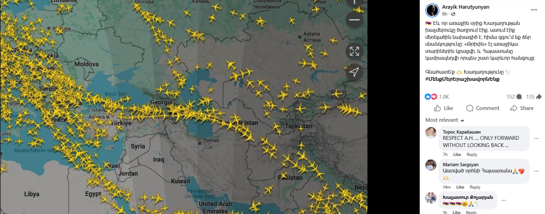 «Ֆեյսբուք» սոցցանցի իր էջում թռիչքներին առցանց հետեւող flightradar24.com կայքից մի պատկեր տեղադրելով՝ Հարությունյանը գրել է. «Էն, որ առաջին օրից Խաղաղության խաչմերուկը ծաղրում էիք, ասում էիք մեռելածին նախագիծ է, հիմա զգու՞մ եք ձեր սնանկությունը: «Թրիփն» էլ առաջիկա տարիներին կբացվի, եւ Հայաստանը կամրապնդվի որպես շատ կարեւոր հանգույց»: