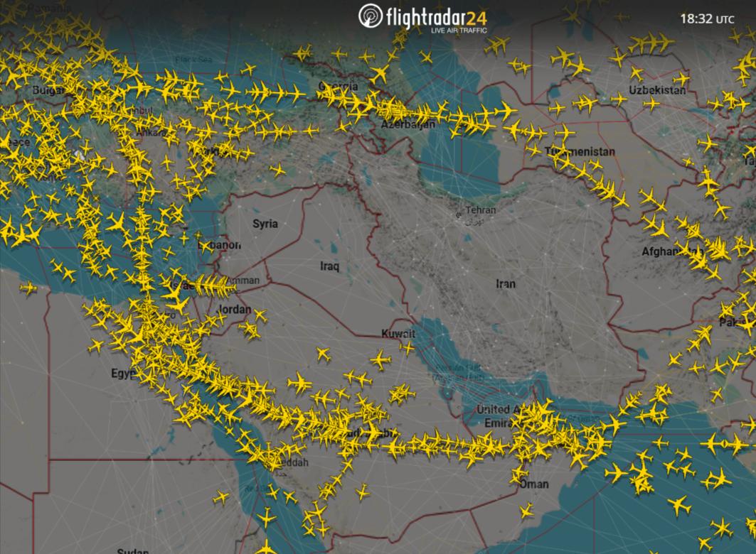 Մինչեւ ԱՄՆ-Իրան-Իսրայել պատերազմի մեկնարկը Եվրոպայից դեպի Մերձավոր Արեւելք, Հնդկաստան, Հարավարեւելյան Ասիա եւ Ավստրալիա թռիչքներն իրականացվում էին Իրանով, Իրաքով, Քաթարով ու ԱՄԷ-ով անցնող օդային մայրուղիներով: Պատերազմի մեկնարկին զուգահեռ այս մեծ հոսքերը դադարել են, ինչը կարելի է տեսնել flightradar24.com-ի տարածած կարճ տեսանյութում: