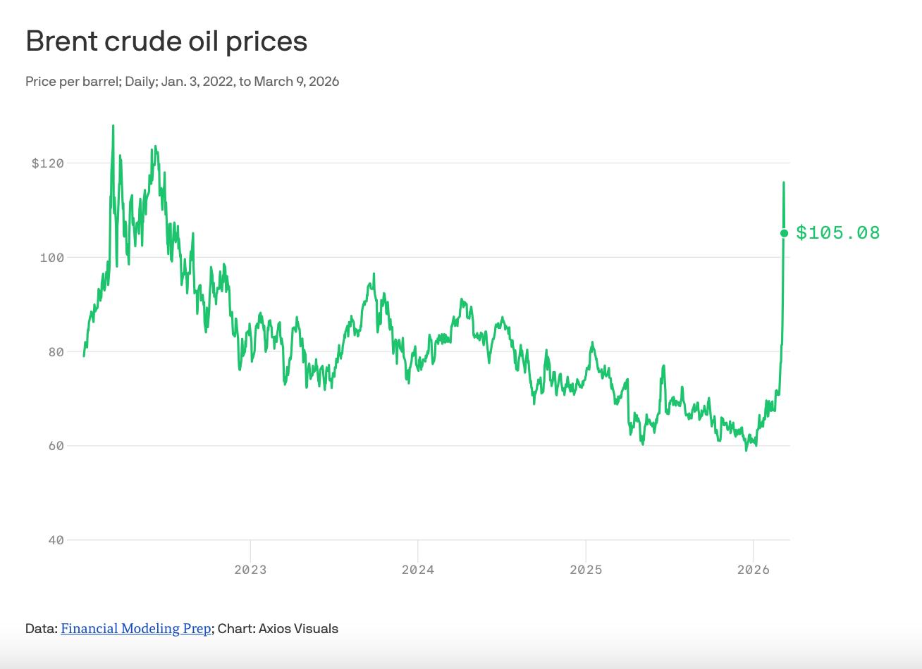 Իրանի դեմ Իսրայելի և ԱՄՆ-ի միջև զինված հակամարտության սրման ֆոնին նավթի համաշխարհային գներն այսօր բարձրացել են ավելի քան 26%-ով։ Ինչպես հաղորդում է Forbes-ը, եթե Լոնդոնի ICE բորսայում ուրբաթ՝ մարտի 7-ին, Brent տեսակի նավթի ֆյուչերսները փակվել են մեկ բարելի դիմաց 92.69 դոլարով, ապա մարտի 9-ի առավոտյան հասել են 119.5 դոլարի։