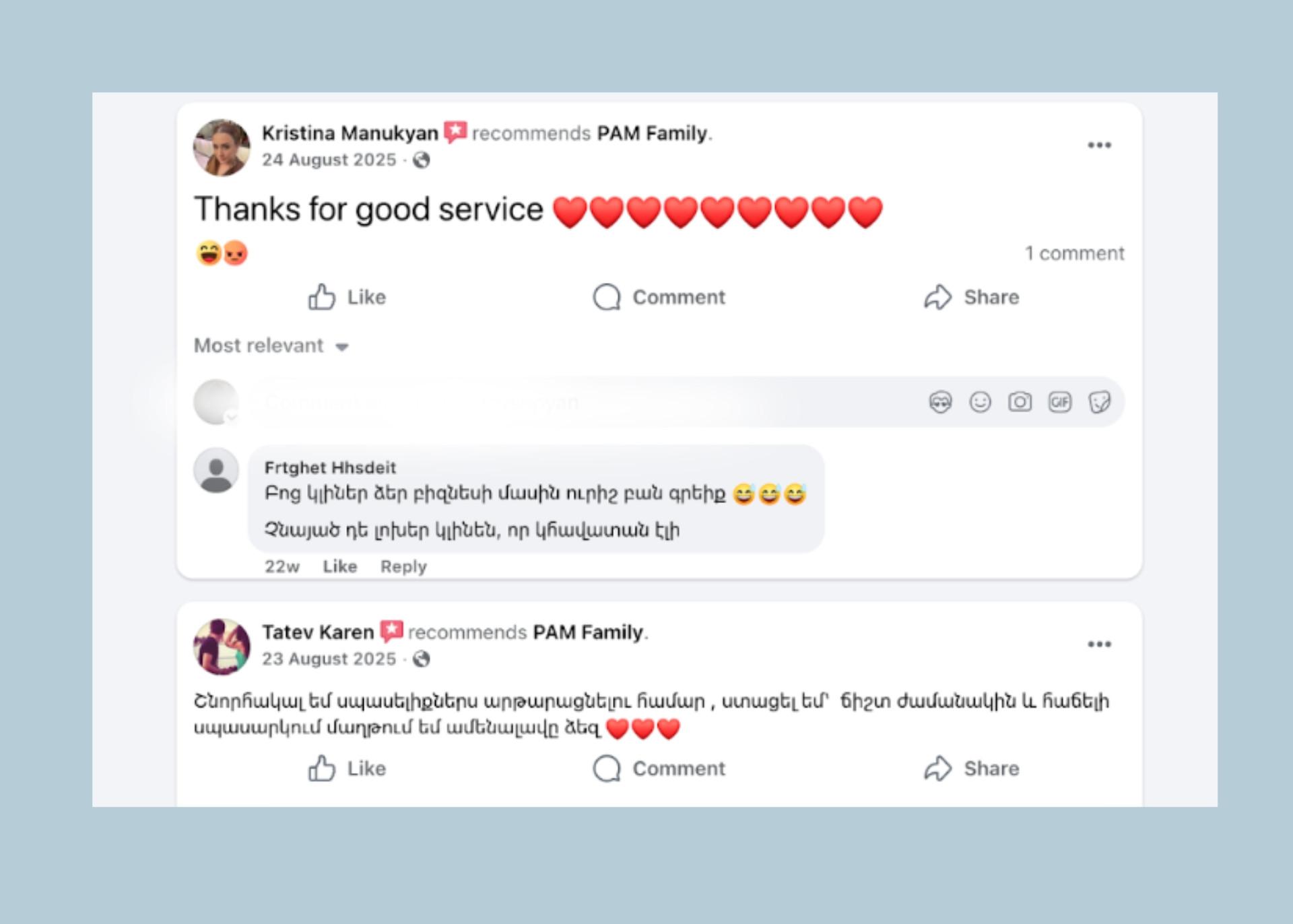 «ՊԱՄ ընտանիք»-ի մասին երբեմն նաև «դրական» կարծիքներ են հանդիպում, որոնց տակ այսպիսի մեկնաբանություններ կան. «Բոց կլիներ ձեր բիզնեսի մասին ուրիշ բան գրեիք»։
