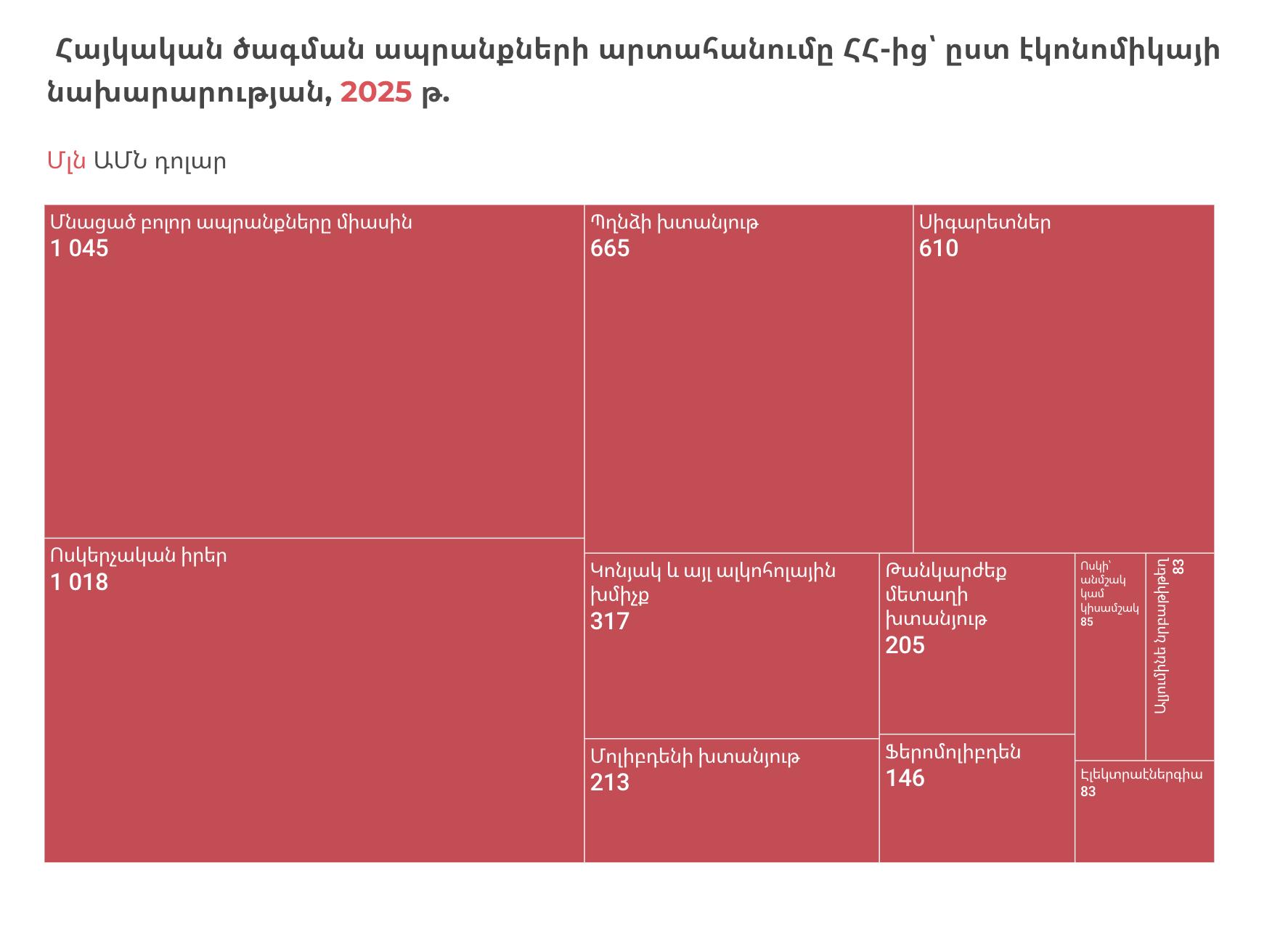 Ստորև ինֆոգրաֆիկայում հայկական ծագման ապրանքների արտահանումն է՝ ըստ Էկոնոմիկայի նախարարության ցանկի։ Առանձնացված են առաջին տասը ապրանքները։