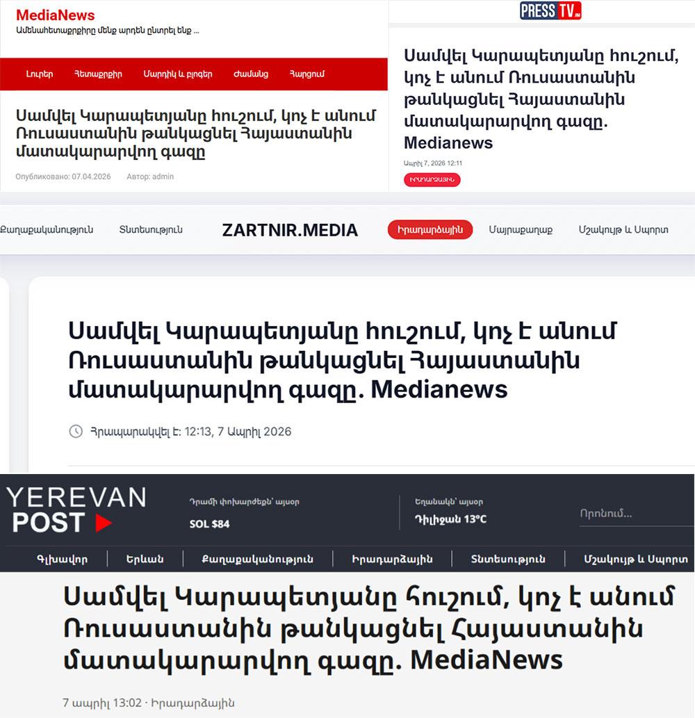 Zartnir.media-ի ռուսալեզու տարբերակում նյութը վերնագրված է շատ ավելի մանիպուլյատիվ ձևով. «Կարևոր. Սամվել Կարապետյանը կոչ արեց Ռուսաստանին բարձրացնել գազի գինը Հայաստանի համար» (Важно: Самвел Карапетян призвал РФ повысить цену на газ для Армении):