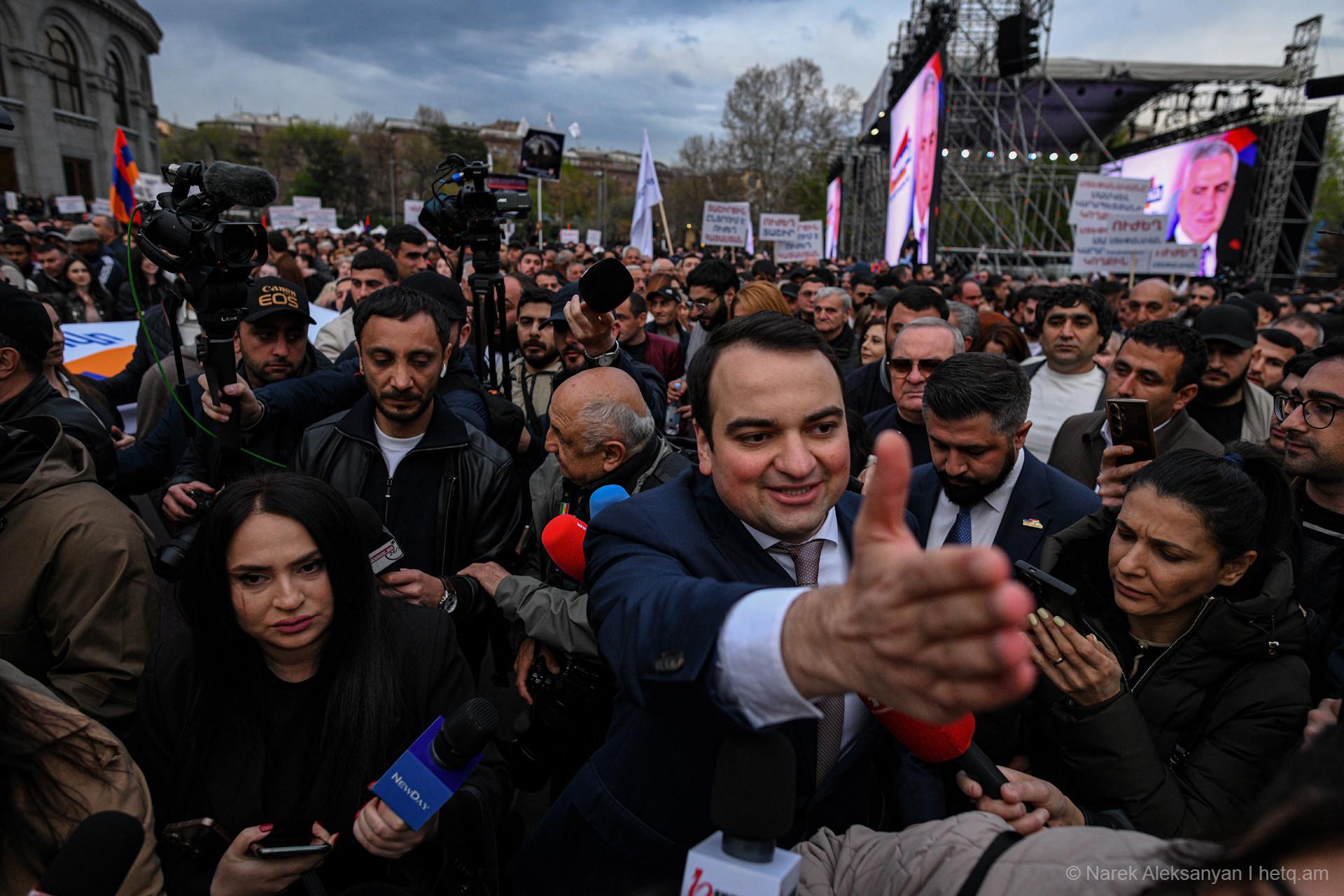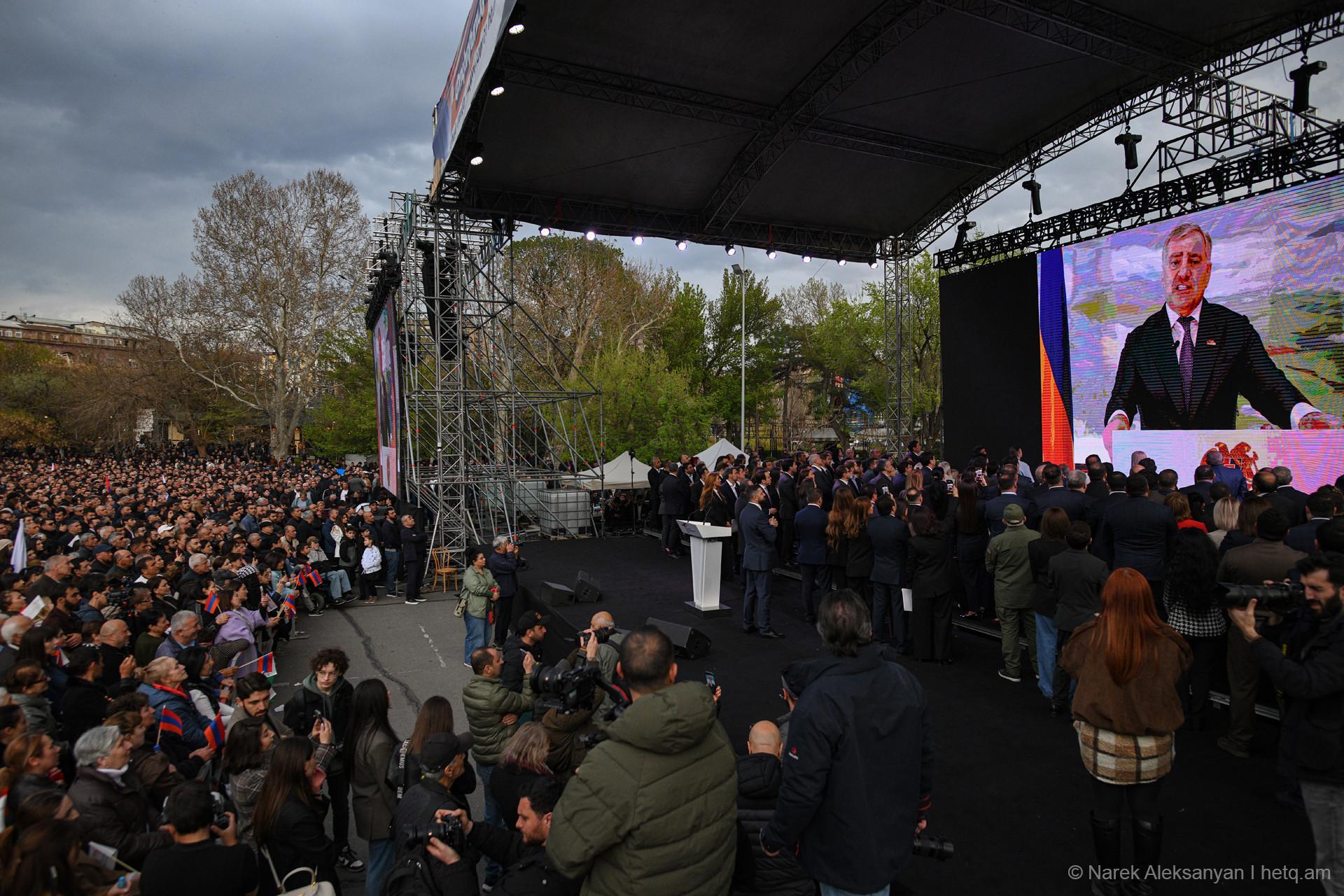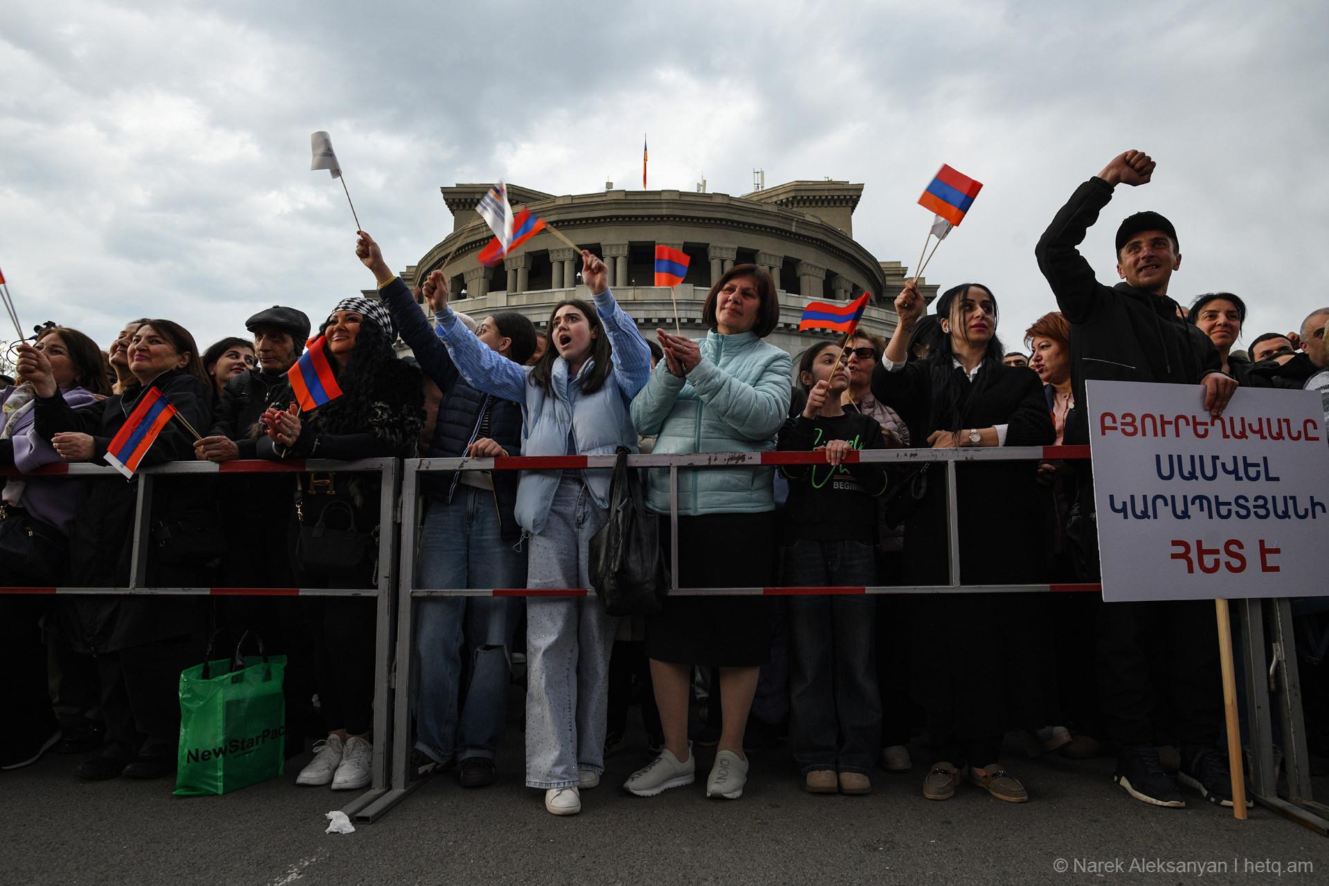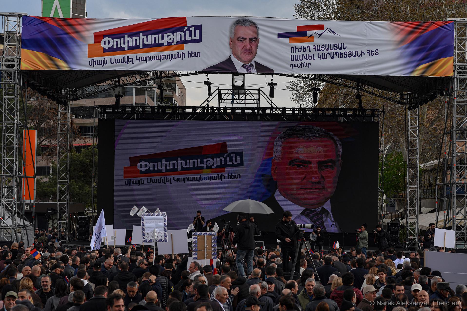 Այսօր՝ ապրիլի 11-ին, Ազատության հրապարակում տեղի ունեցավ «Ուժեղ Հայաստան Սամվել Կարապետյանի հետ» դաշինքի հանրահավաքը։ Հանրահավաքից առաջ կազմակերպիչները հայտարարել էին, որ առաջին անգամ ուղերձով հանդերձ կգա Սամվել Կարապետյանը։ Տնային կալանքի տակ գտնվող Կարապետյանի՝ նախապես նկարահանված «Փոփոխության ելույթ»-ը Ազատության հրապարակում հնչեց բեմում տեղադրված մեծ էկրաններից։