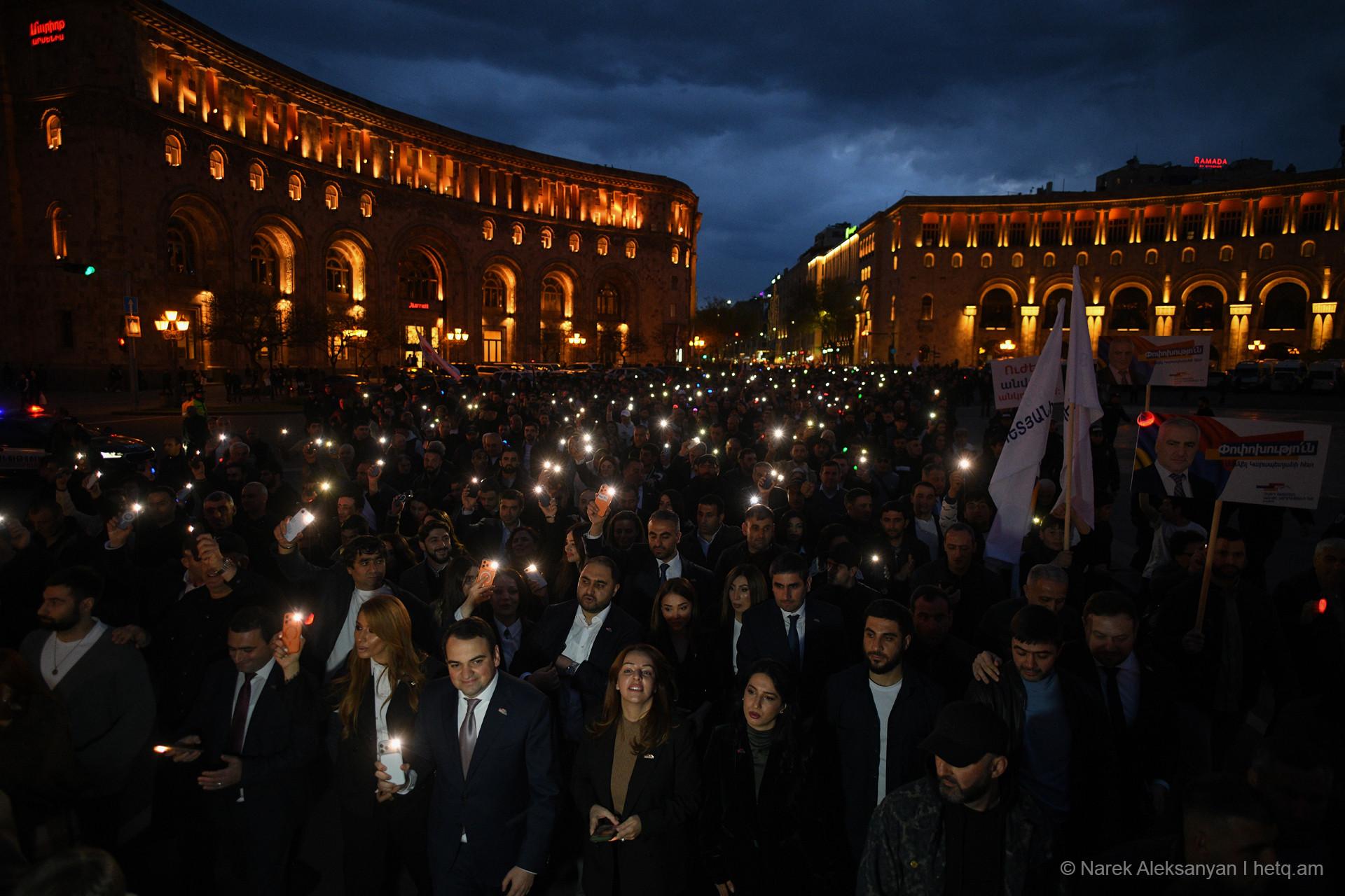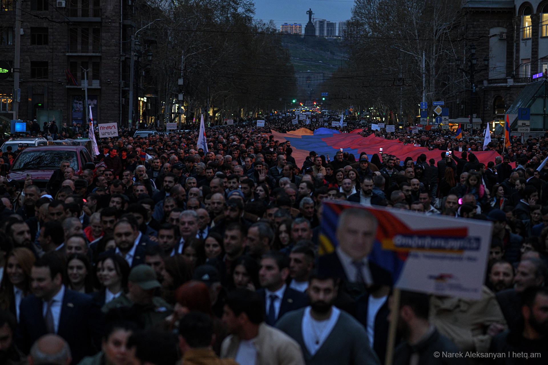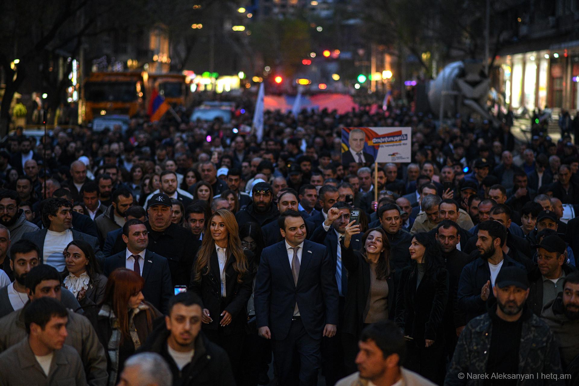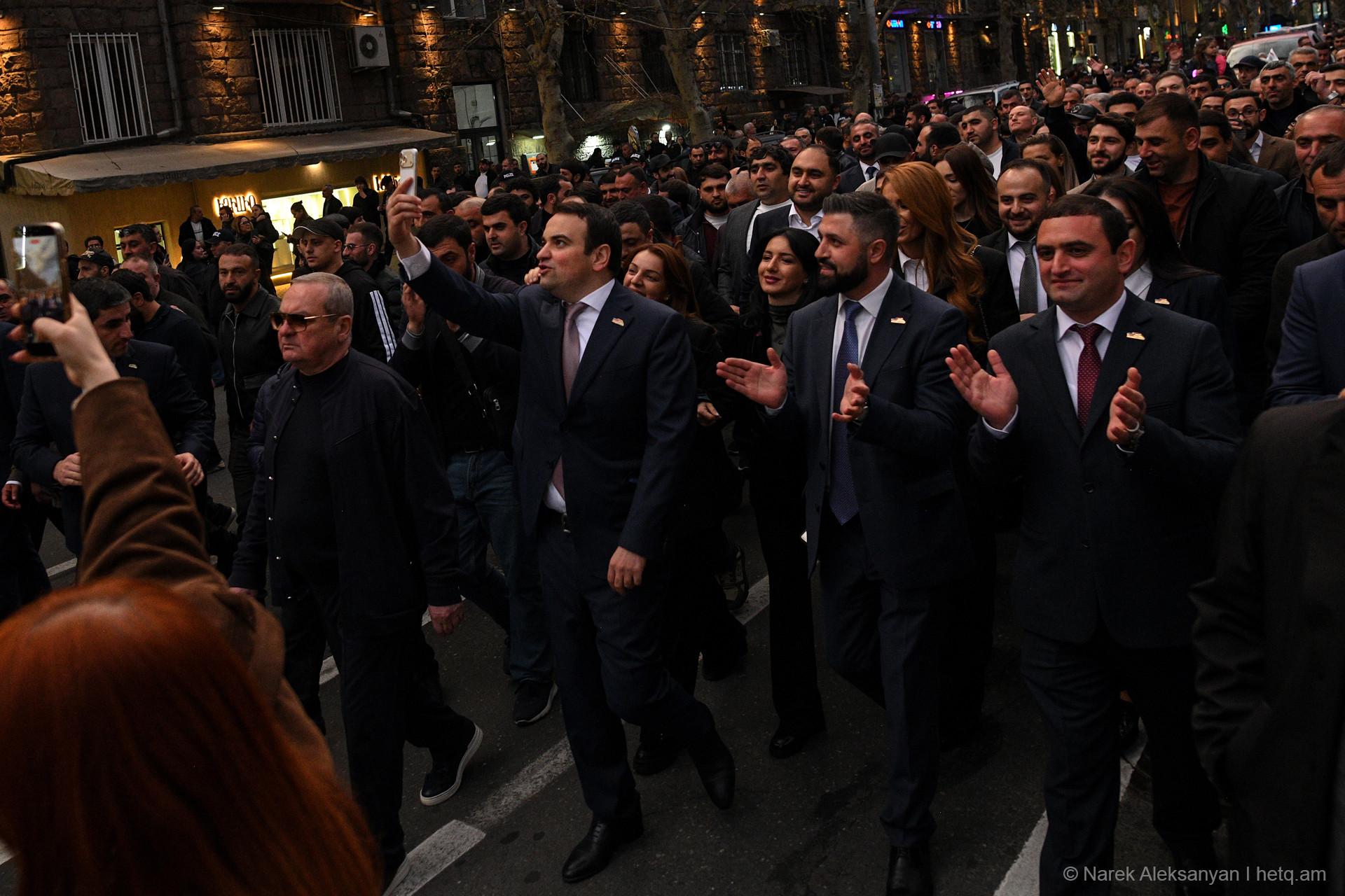 «Փոփոխություն միայն Սամվել Կարապետյանի հետ» կարգախոսով հանրահավաքին հաջորդեց երթ, որն առաջնորդում էր «Ուժեղ Հայաստան» դաշինքի ընտրական ցուցակի առաջին համար Նարեկ Կարապետյանը, Սամվել Կարապետյանի եղբայր Կարեն Կարապետյանը, անվտանգության հարցերով թիմի ղեկավար Արթուր Ավանեսյանը (Կանդազ)։