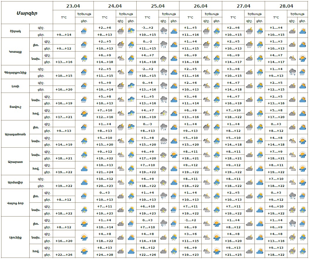 Հանրապետության տարածքում ապրիլի 23-ի ցերեկը, 24-28-ին առանձին շրջաններում ժամանակ առ ժամանակ սպասվում է անձրև և ամպրոպ, առանձին հատվածներում հնարավոր է նաև կարկուտ: Ապրիլի 24-ի ցերեկը և 25-ի գիշերն առանձին շրջաններում տեղումները կլինեն ինտենսիվ։ Ապրիլի 25-ին և 28-ին տեղումները լեռնային շրջաններում գիշերը և առավոտյան ժամերին կլինեն թաց ձյան տեսքով։