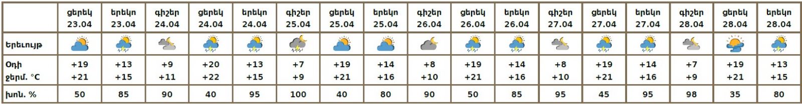Երևանում ապրիլի 23-ին կեսօրից հետո, 24-ին, 25-ի գիշերը, 26-28-ին կեսօրից հետո սպասվում է անձրև և ամպրոպ, ամպրոպի ժամանակ՝ քամու ուժգնացում մինչև 16-19մ/վ արագությամբ։ Ապրիլի 25-ի ցերեկը, 26-ի գիշերը սպասվում է առանց տեղումների եղանակ։