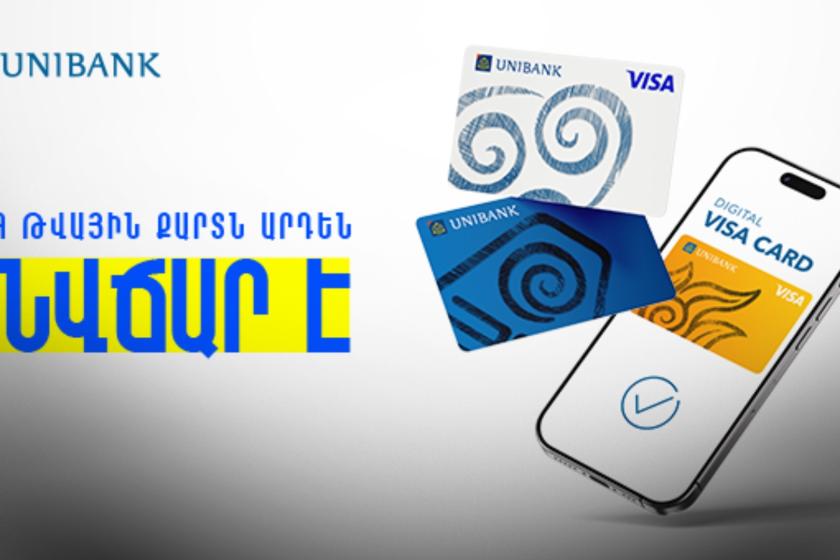 В Юнибанке оформление цифровых карт Visa стало бесплатным для клиентов-резидентов. Оформить карту можно мгновенно через мобильное приложение UNIMobile — достаточно выбрать наиболее понравившийся дизайн и валюту: драмы РА, доллары США или евро.