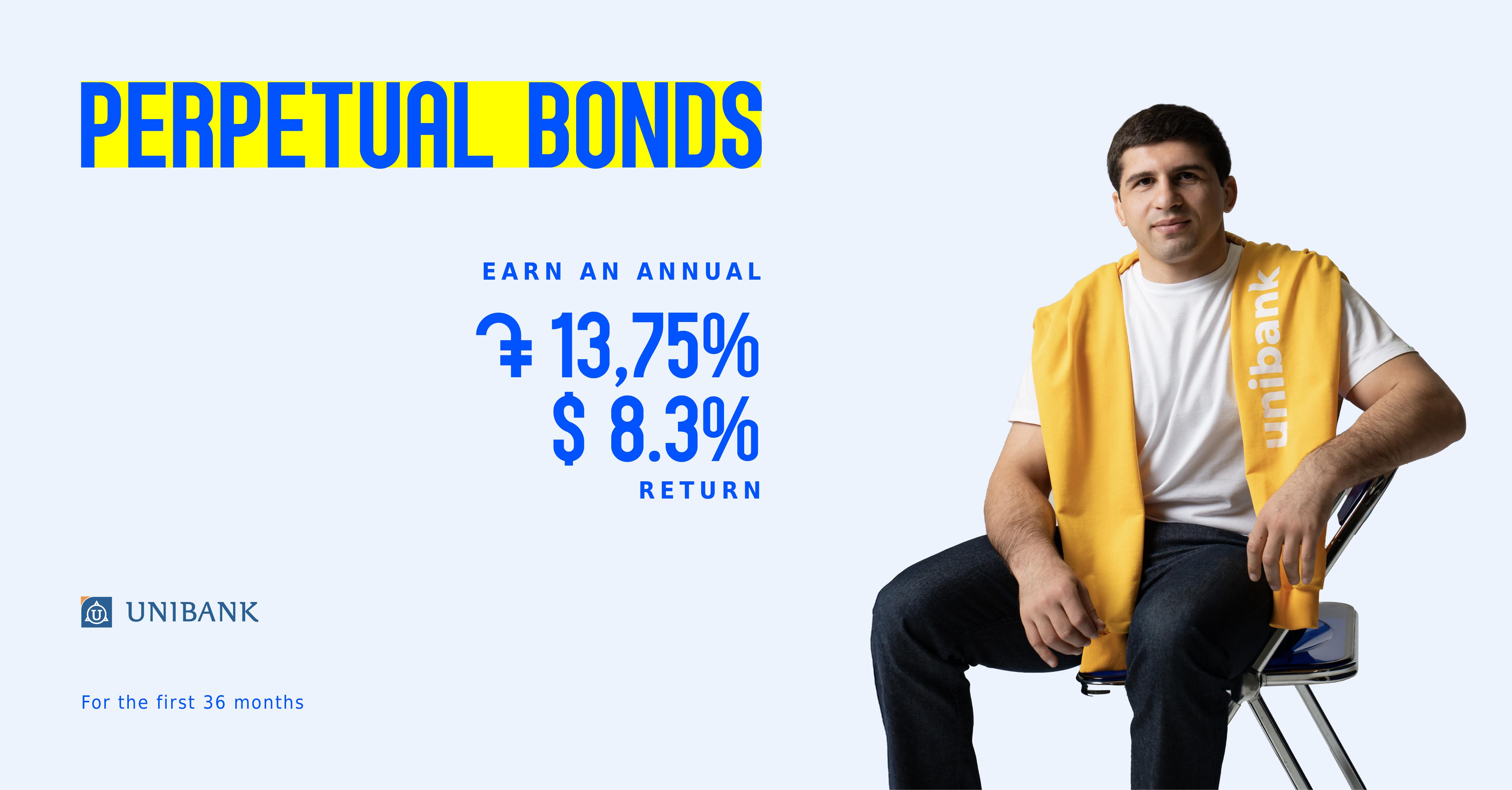 Unibank announces the placement of the first perpetual bonds in the Armenian market, with a total volume of AMD 3.5 billion and USD 9 million. The coupon yield is set at 13.75% per annum for the AMD-denominated bonds and 8.3% per annum for the USD-denominated bonds.