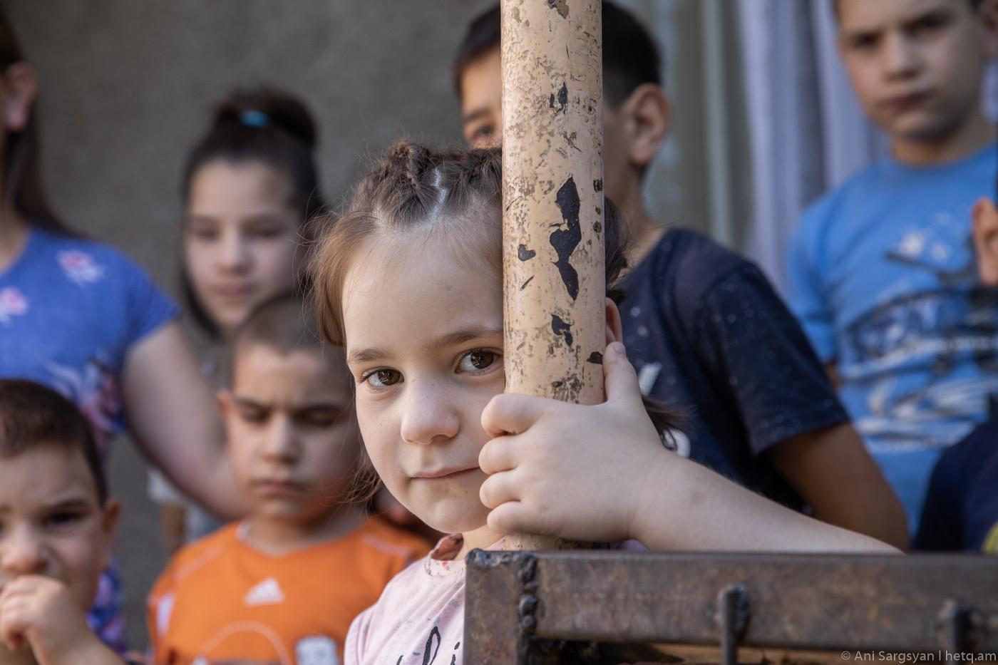 Երկհարկանի վթարային շենքի բակ ենք հասնում։ Աստիճանների տակ լվացքի պարանն է՝ հագուստը ըստ գույնի եւ չափի անխախտ դասավորությամբ է փռված։ Տան մուտքի մոտ մեզ դիմավորում է 9 երեխաների մայրը՝ Աիդան։ Մինչ մի քանի բառ կփոխանակեինք, երեխաները շատանում են նրա շուրջ՝ մեկը մյուսից պայծառ աչքերով։ Նրանք շուտով Աիդային օղակում են։ Երեխաները մաքուր ու կոկիկ են հագնված, եւ աստիճանաբար նրանց քննախույզ հայացքը փոխարինվում է ժպիտի։