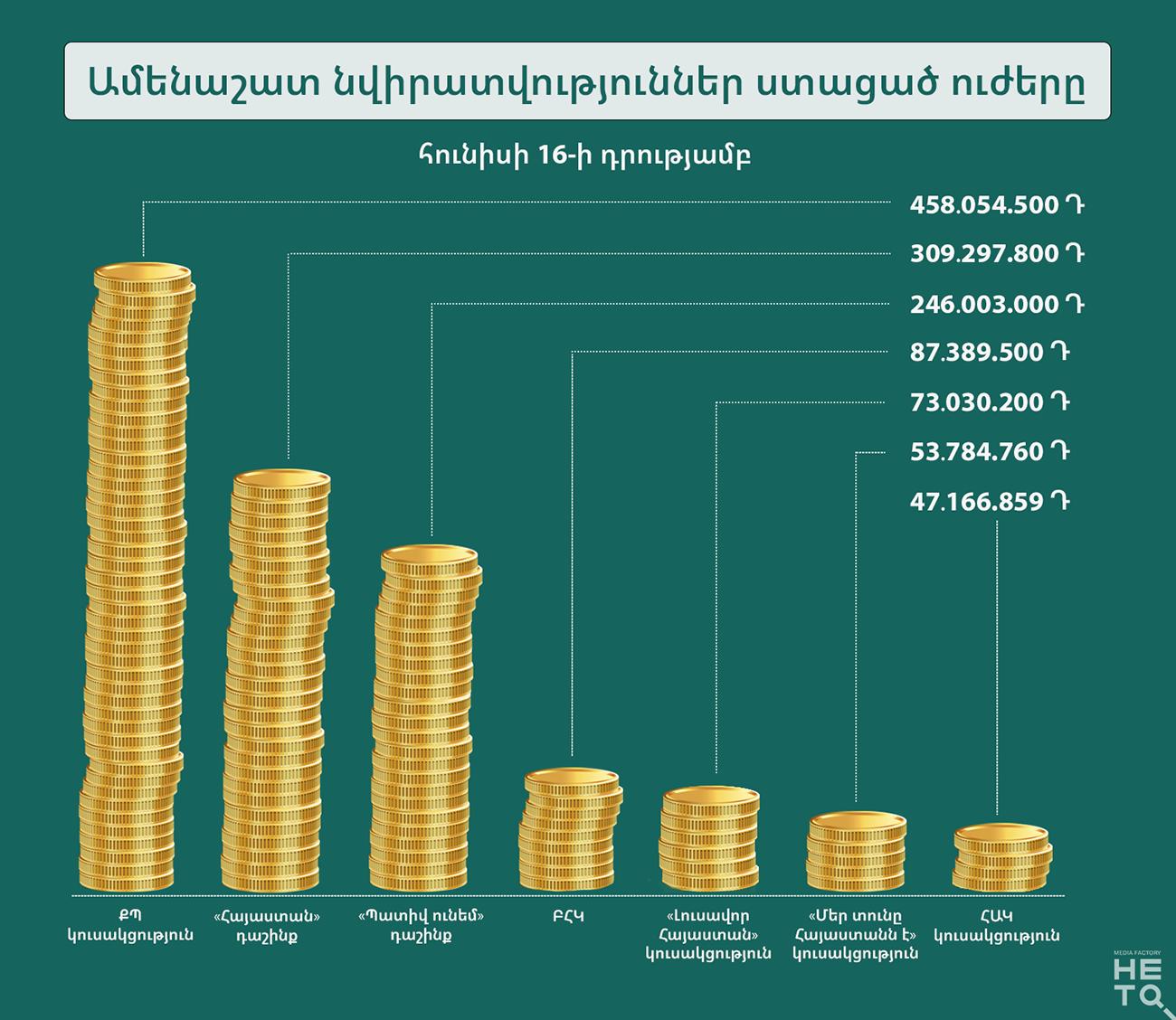 Հունիսի 16-դրությամբ՝ «Հայաստան» դաշինքը ստացել է ընդհանուր առմամբ 309 մլն դրամի նվիրատվություն։