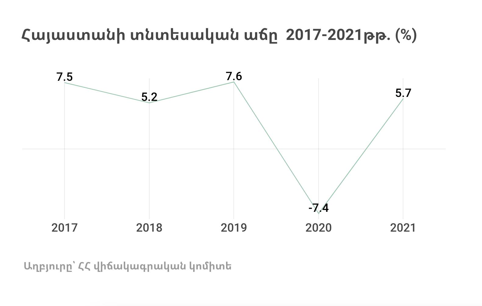2020 թվականին Հայաստանում գրանցվել է 7.4% տնտեսական անկում։ Այսինքն՝ 2021-ին գրանցված 5.7% աճը դեռևս ամբողջությամբ չի «փակել» նախորդ տարվա վնասները։
