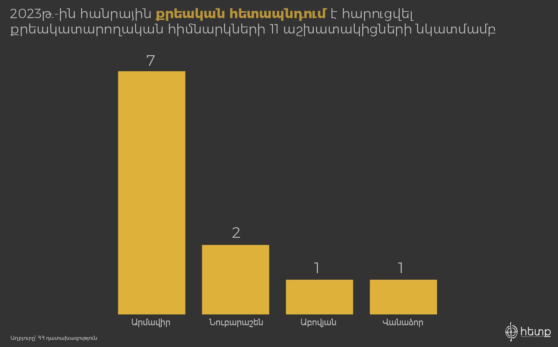 Գլխավոր դատախազության փոխանցմամբ՝ քրեակատարողական հիմնարկի աշխատակիցների շրջանում ամենահաճախ հանդիպող հանցագործության դեպքերը վերաբերում են կաշառք ստանալուն կամ թմրանյութի ապօրինի շրջանառությունը: Նրանց նկատմամբ 2022թ. հարուցվել է 8 հանրային քրեական հետապնդում, իսկ 2023թ-ին՝ 11: Ամենաշատ դեպքերն արձանագրվել են «Արմավիր» քրեակատարողական հիմնարկում: