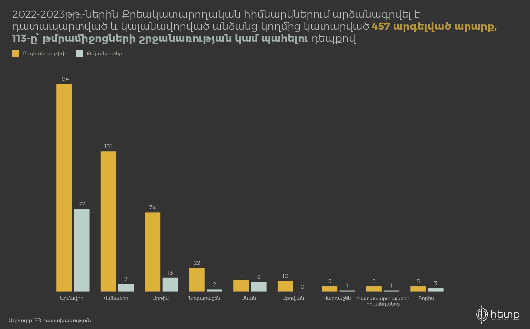 Գլխավոր դատախազության փոխանցմամբ՝ 2022-2023թթ. ընթացքում Հայաստանի ՔԿՀ-ներում դատապարտված և կալանավորված անձանց կողմից Քրեական օրենսգրքով արգելված արարք կատարելու 457 դեպք է արձանագրվել, որից 155-ը՝ 2022թ., իսկ 302-ը՝ 2023-ին: Ամենաշատ դեպքերն արձանագրվել են դարձյալ «Արմավիր» քրեակատարողական հիմնարկում: Այստեղ են պահվում ամենամեծ թվով դատապարտյալներն ու կալանավորված անձինք: Հաջորդը՝ «Վանաձոր» ՔԿՀ-ն է: