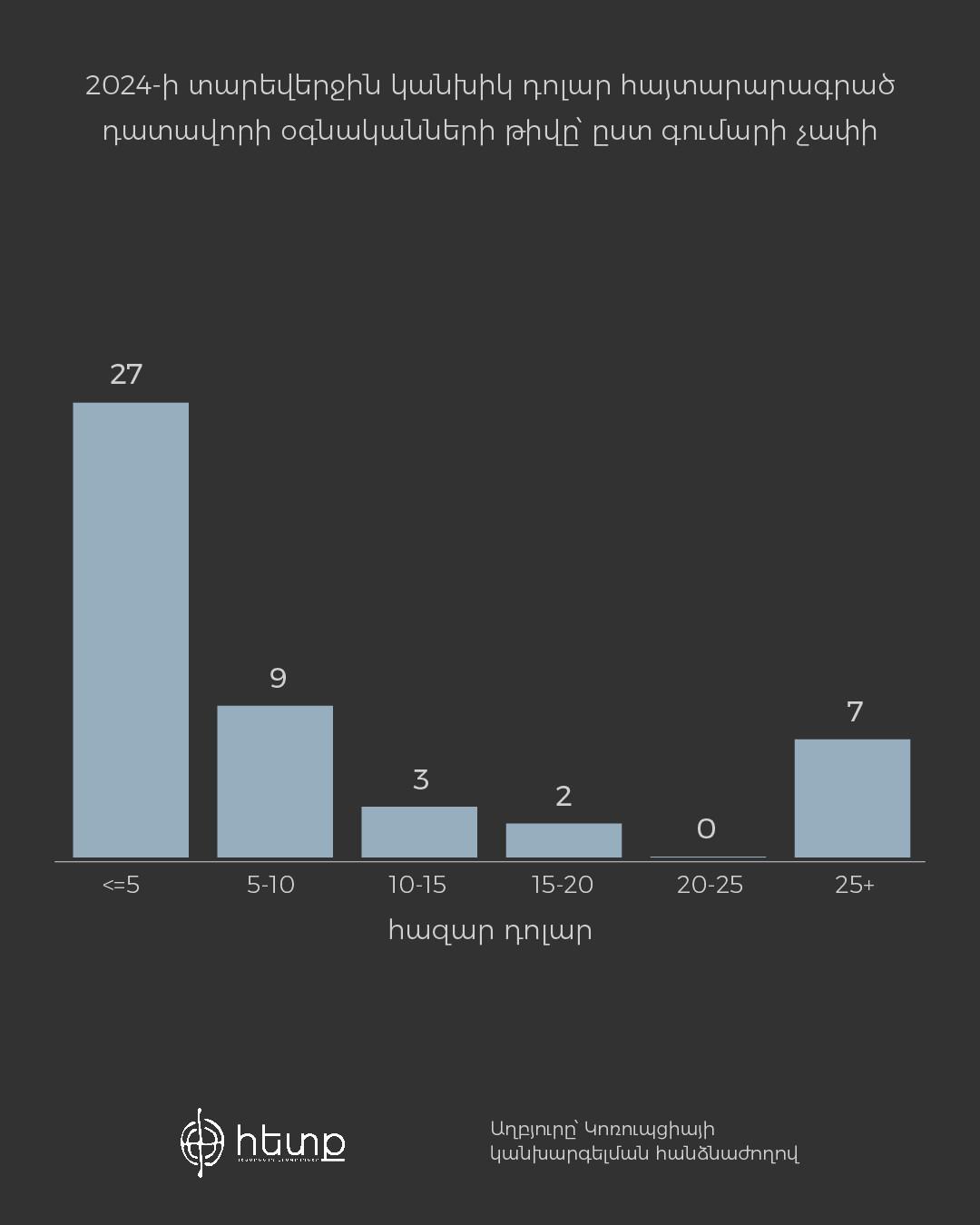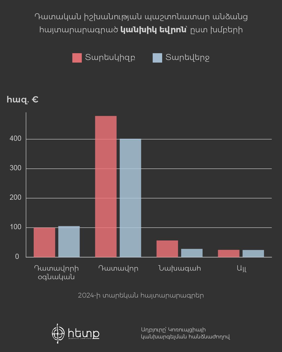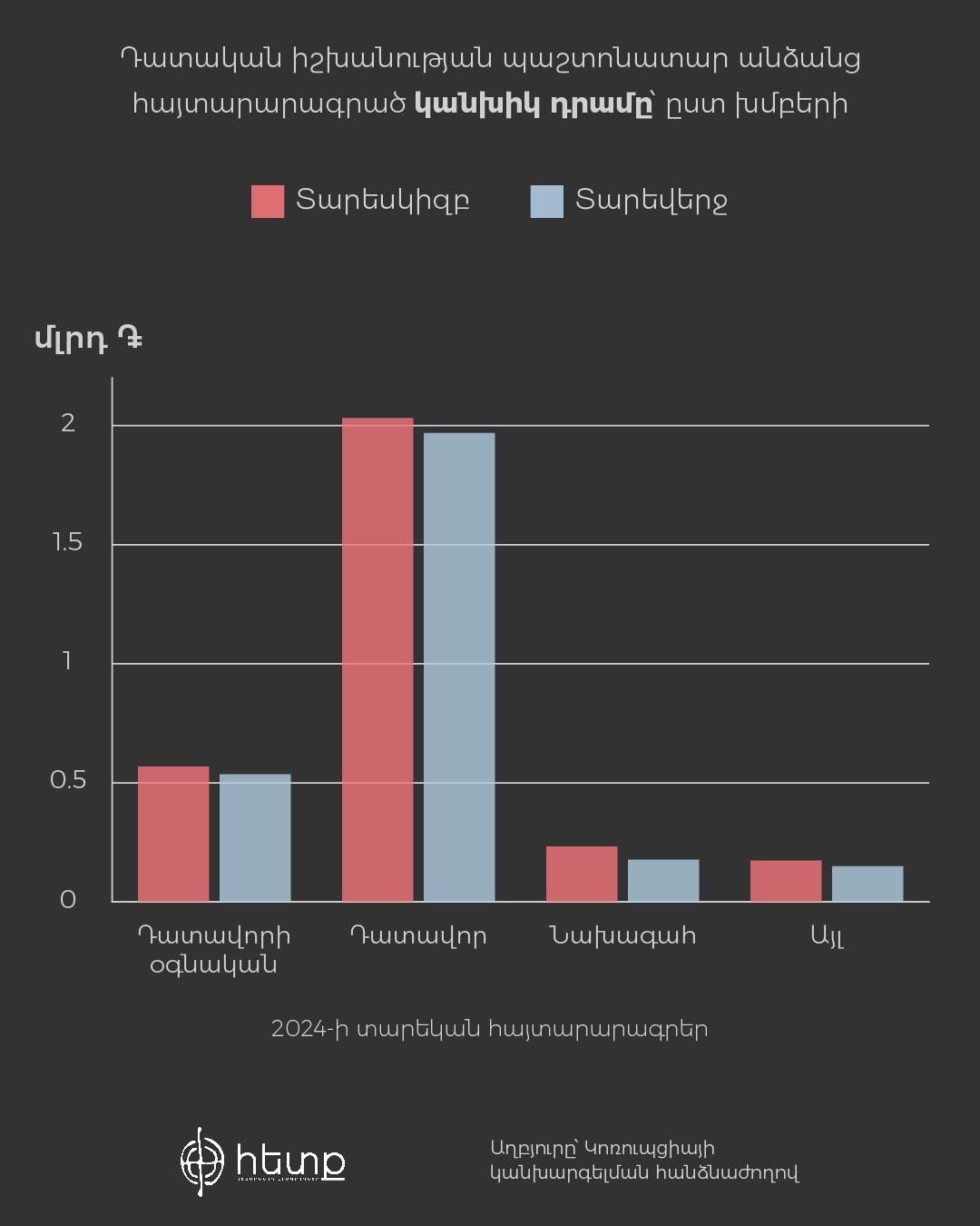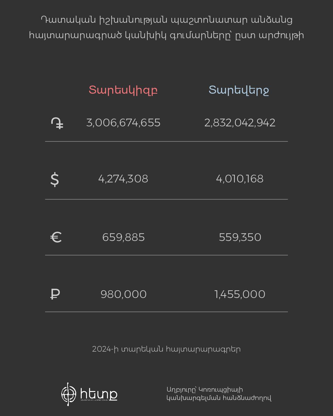 Օրինակ՝ Կոտայքի մարզի առաջին ատյանի ընդհանուր իրավասության դատարանի նախագահ Գեղամ Մարգարյանը 2024թ. վերջին ունեցել է 38 մլն դրամ կանխիկ գումար, իսկ Երևան քաղաքի ընդհանուր իրավասության քաղաքացիական դատարանի նախագահ Ավագ Գաբրիելյանը՝ 130 հազ. դոլար և այլն: