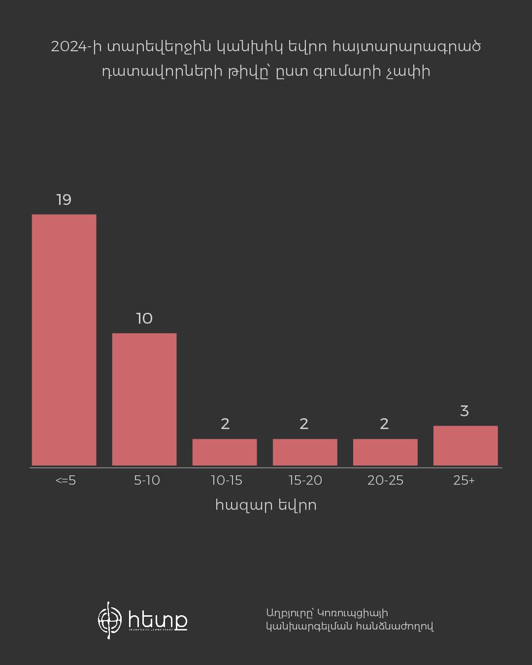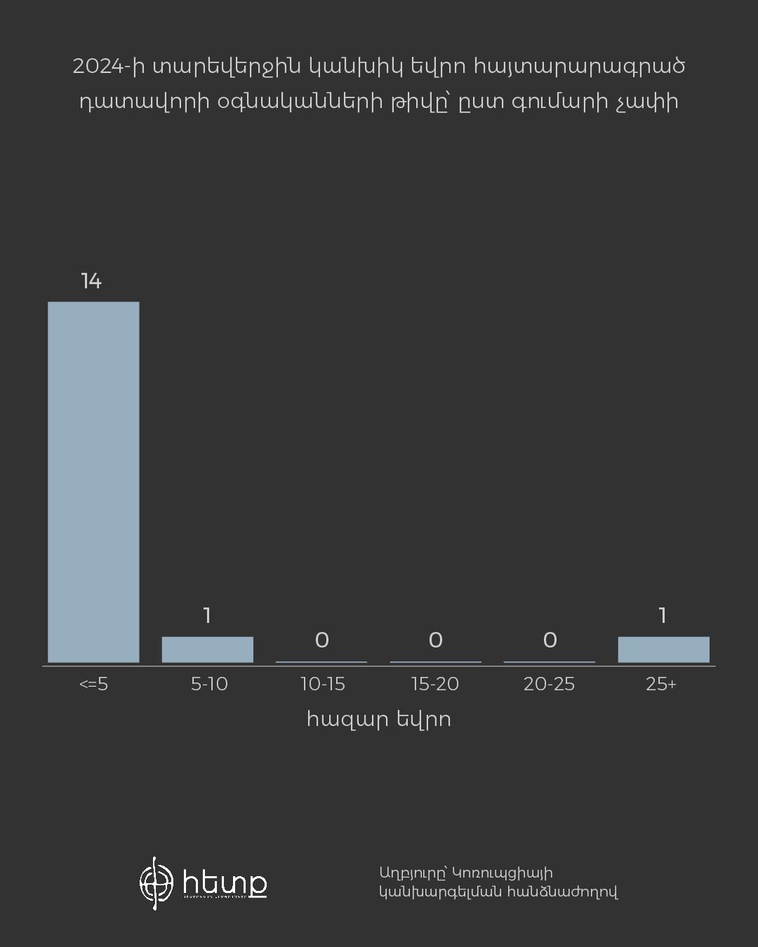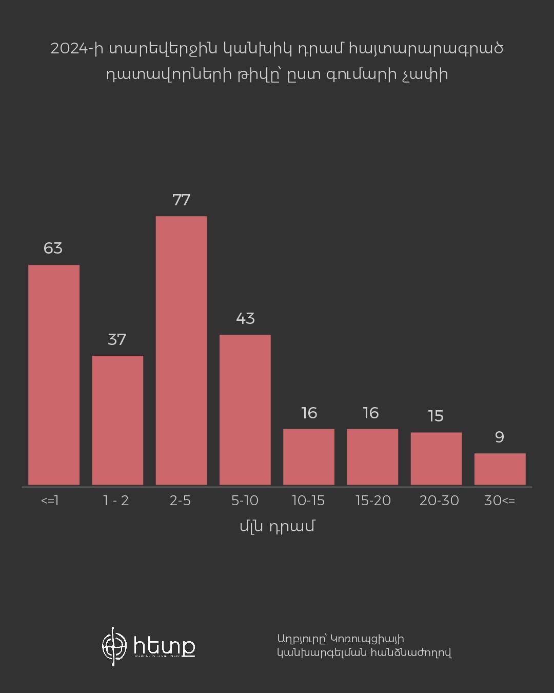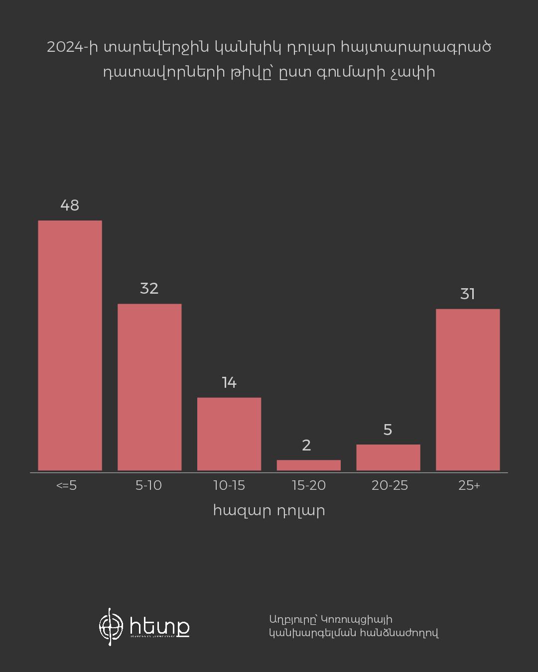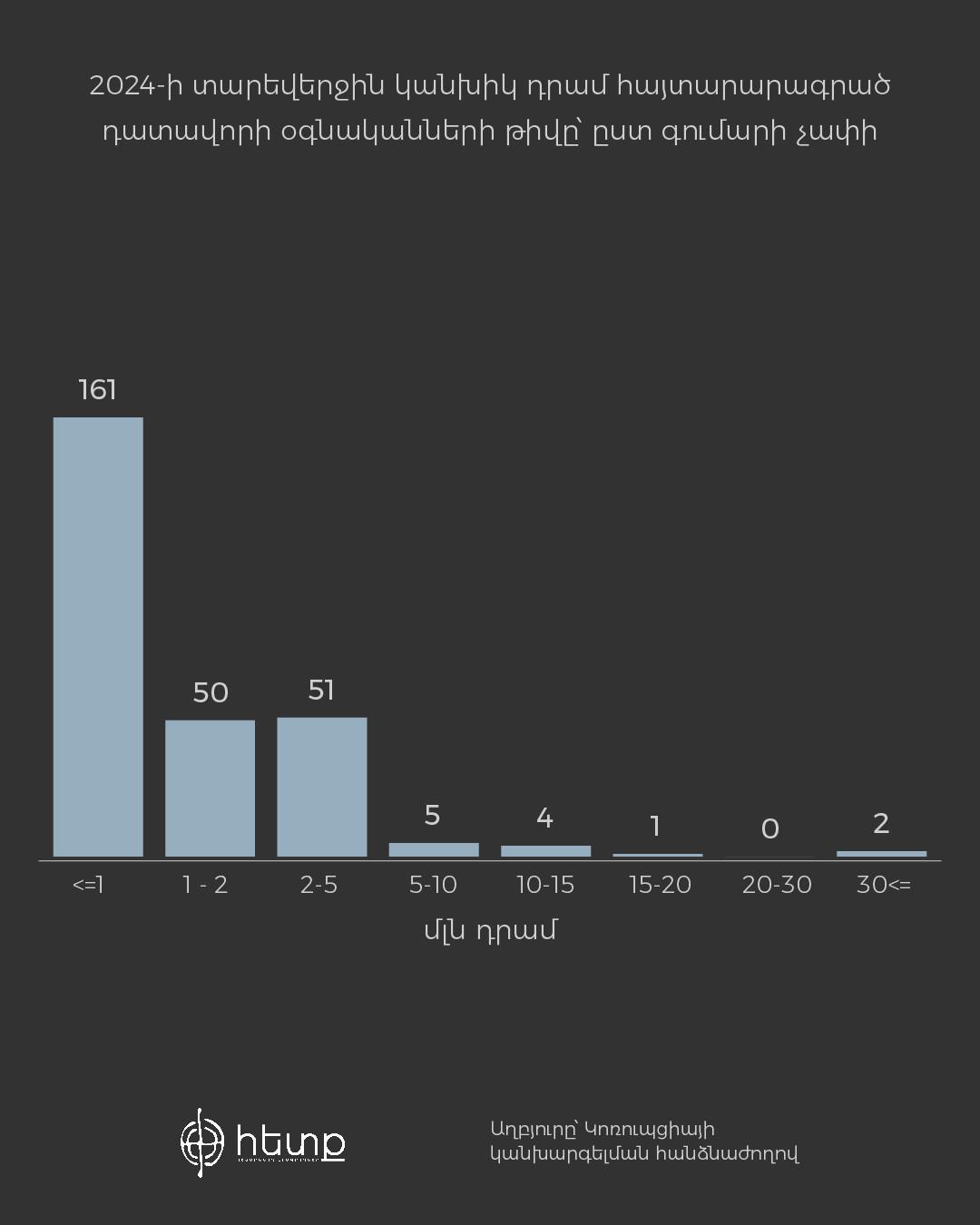 Օրինակ՝ Կոտայքի մարզի առաջին ատյանի ընդհանուր իրավասության դատարանի նախագահ Գեղամ Մարգարյանը 2024թ. վերջին ունեցել է 38 մլն դրամ կանխիկ գումար, իսկ Երևան քաղաքի ընդհանուր իրավասության քաղաքացիական դատարանի նախագահ Ավագ Գաբրիելյանը՝ 130 հազ. դոլար և այլն:
