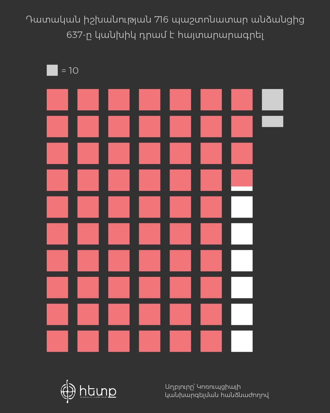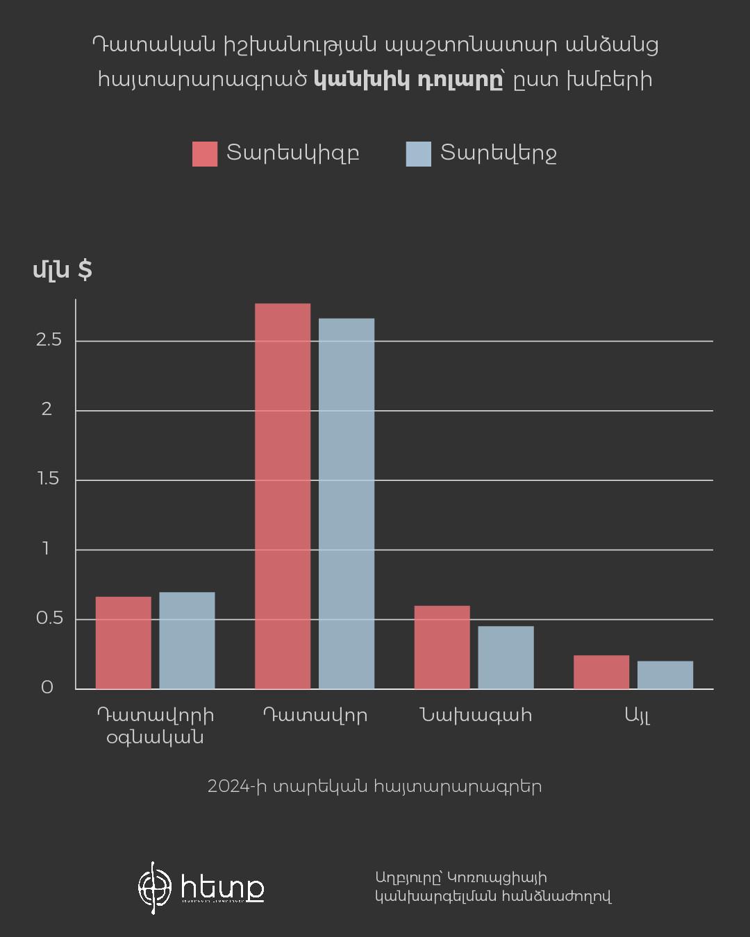 Դատական իշխանությունը ներկայացնող 716 պաշտոնատար անձ Կոռուպցիայի կանխարգելման հանձնաժողով 2024թ. վերաբերյալ տարեկան հայտարարագիր է ներկայացրել։ 716 անձանց 89%-ը կամ 638-ը կանխիկ գումար է հայտարարագրել։ Որոշ դեպքերում կանխիկ գումարի չափը հասնում է մինչև 70 մլն դրամի։