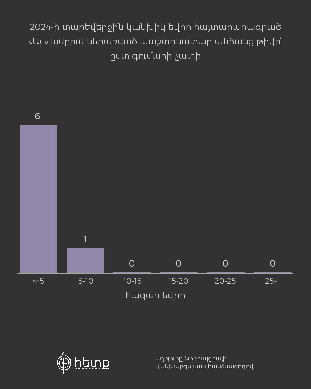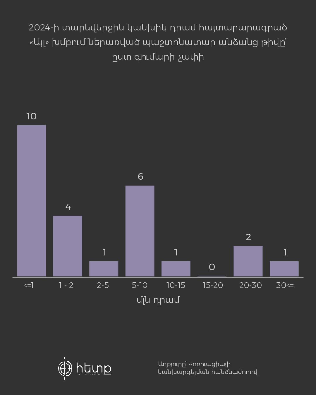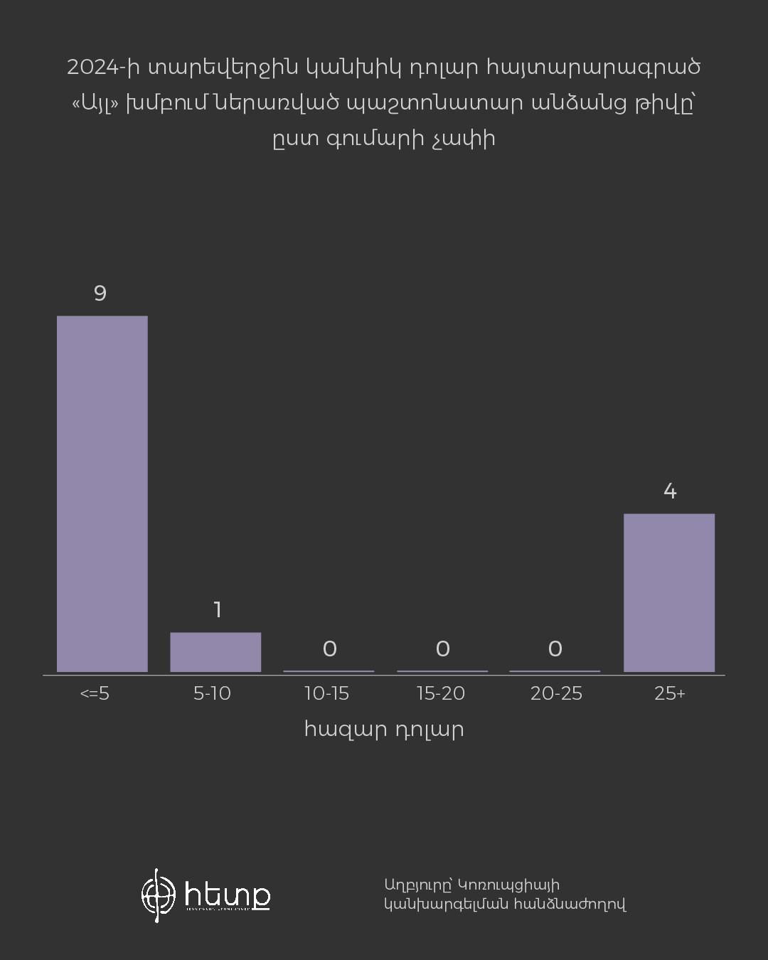«Այլ» անվամբ խմբում ներառել ենք բոլոր այն պաշտոնատար անձանց, որոնք ներառված չեն մյուս խմբերից որևէ մեկում։ Օրինակ՝ աշխատակազմի ղեկավարներ, խորհրդականներ և այլն։ 30 պաշտոնատար անձ ներառվել է վերոնշյալ խմբում, որոնցից 27-ը կանխիկ դրամ է հայտարարագրել: Այս խմբում ներառված պաշտոնյանները 2024-ին տարեվերջին ընդհանուր ունեցել են 200․5 հազար դոլար, 150․3 մլն դրամ և 24․2 հազար եվրո։