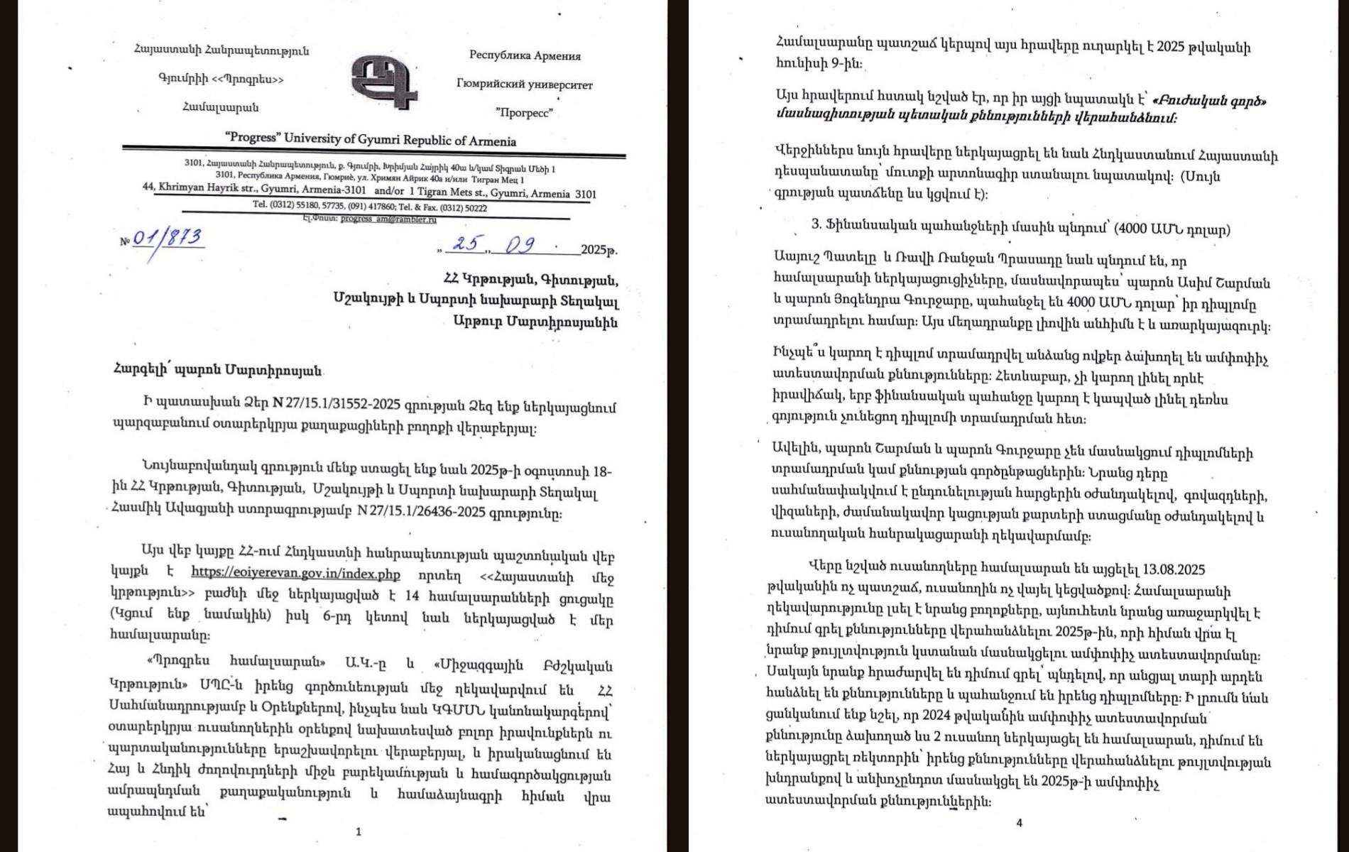 Գյումրու «Պրոգրես» համալսարանում ուսանողները մեկ տարվա ուսման համար վճարել են 4000 դոլար, չնայած, ըստ պայմանագրի, իրենց ուսման վճարը եղել է 3000 դոլար: Ընդ որում, ուսանողների ու համալսարանի ռեկտորի միջև պայմանագրի մեջ, որն ուսանողներին տրամադրում են գործակալները, արժույթը դոլարն է: 2022-2023 թվականների պայմանագիրը նկարել էր ուսանողներից մեկը: