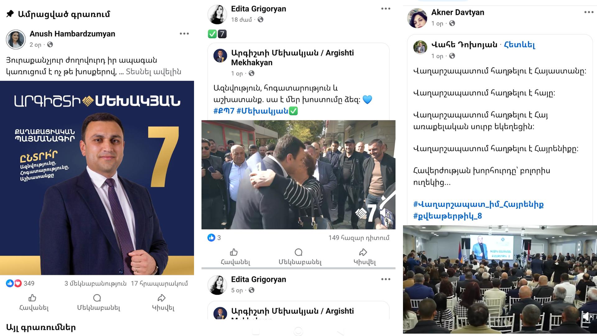 Թիվ 14/44 տեղամասային հանձնաժողովի քարտուղար Էդիտա Գրիգորյանն իր ֆեյսբուքյան էջում ևս ակտիվ քարոզչություն է իրականացնում՝ տարածելով Արգիշտի Մեխակյանի լուսանկարով քարոզչական նյութեր։ Պարզաբանում ստանալու նպատակով նույն սոցիալական հարթակով գրեցինք Է․ Գրիգորյանին։ Նա հետևյալ պատասխանը տվեց․ «իմ անձնական էջով կարող եմ կիսվել այն ամենով, ինչ ինքս եմ ցանկանում, օրենքն ինձ չի արգելում վարել անձնական էջս, այսուհետ ինձ այլևս չանհանգստացնեք»։