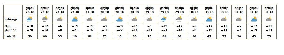Հոկտեմբերի 26-ի և 29-ի ցերեկը սպասվում է կարճատև անձրև։ Հոկտեմբերի 27-28-ին և 30-31-ին սպասվում է առանց տեղումների եղանակ։