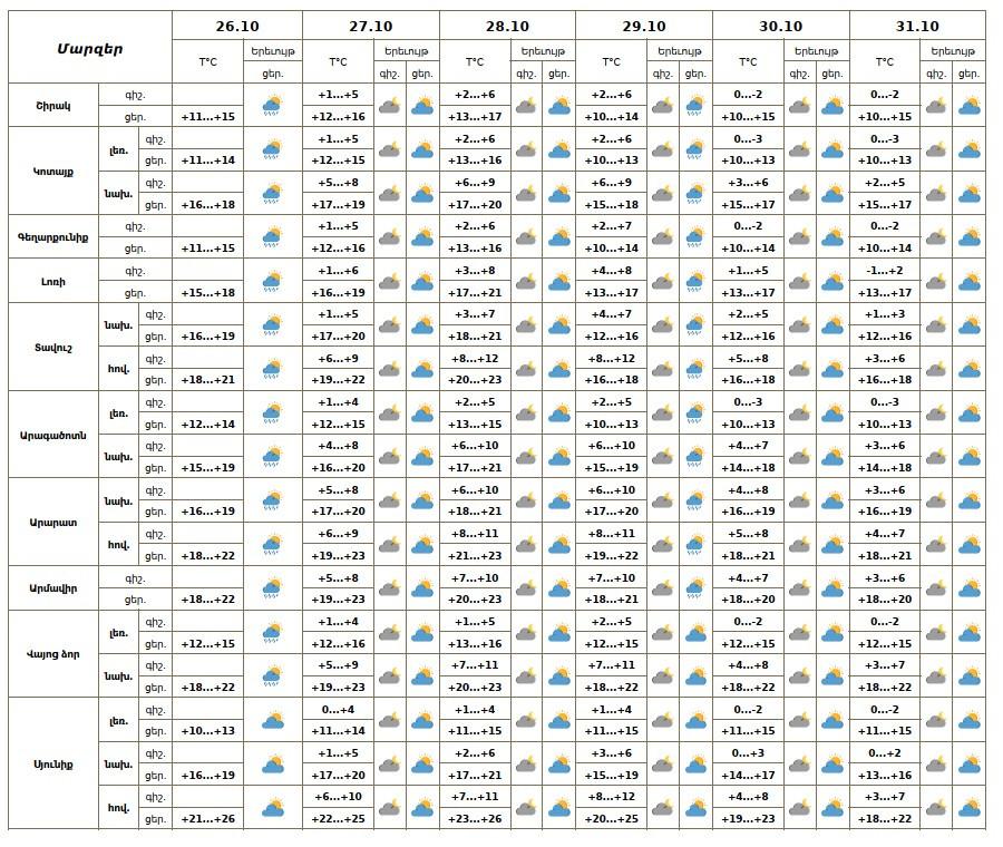 Հոկտեմբերի 26-ի և 29-ի ցերեկն առանձին շրջաններում սպասվում է կարճատև անձրև։ Հոկտեմբերի 27-28-ին և 30-31-ին սպասվում է առանց տեղումների եղանակ: Քամին արևմտյան՝ 2-5մ/վ: Օդի ջերմաստիճանը հոկտեմբերի 26-ի ցերեկը կնվազի 2-3 աստիճանով, 27-28-ին աստիճանաբար նույնքան կբարձրանա։