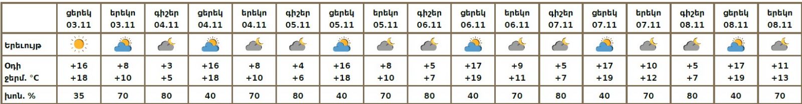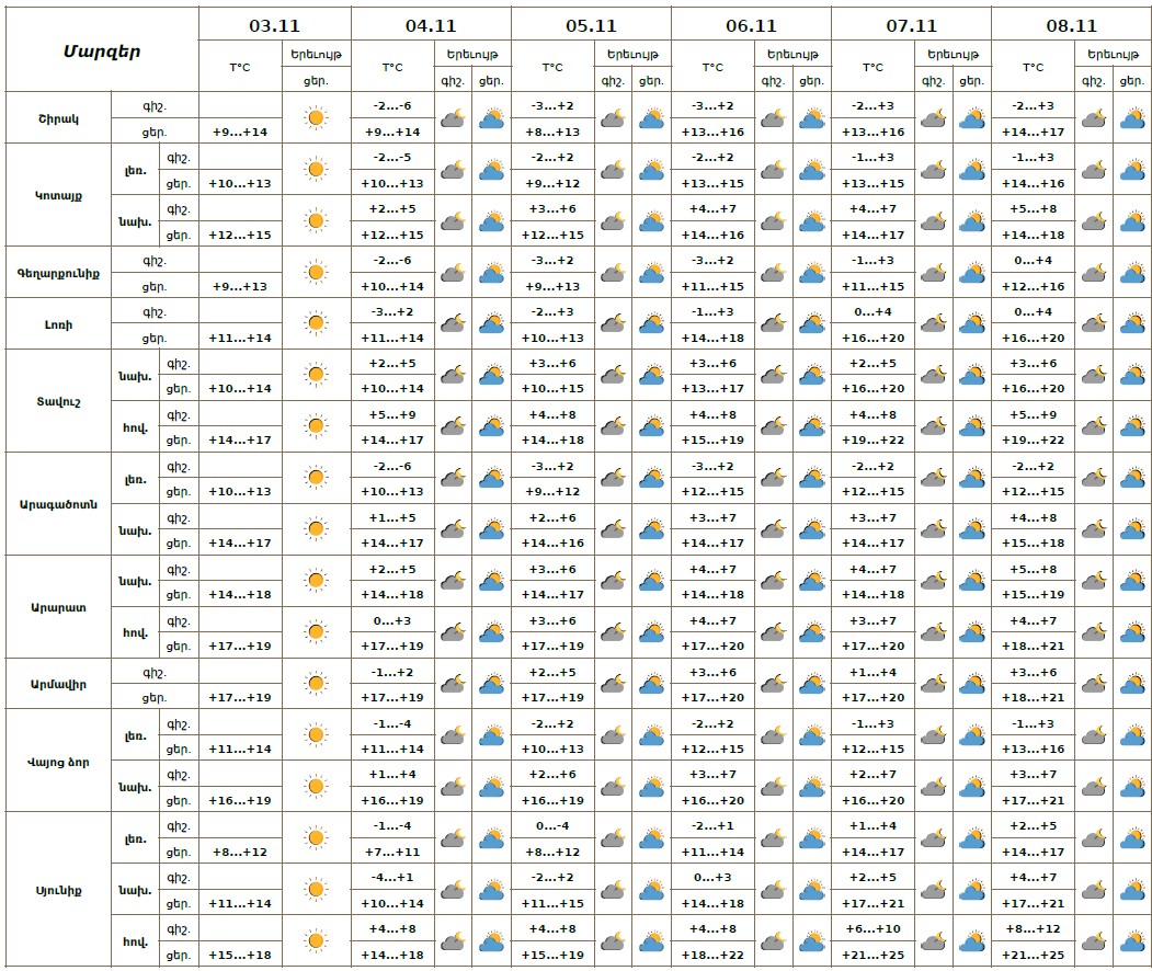 Նոյեմբերի 3-ի ցերեկը, նոյեմբերի 4-8-ին սպասվում է առանց տեղումների եղանակ: Քամին hյուսիսարևմտյան՝ 2-5մ/վ: Օդի ջերմաստիճանն էապես չի փոխվի։