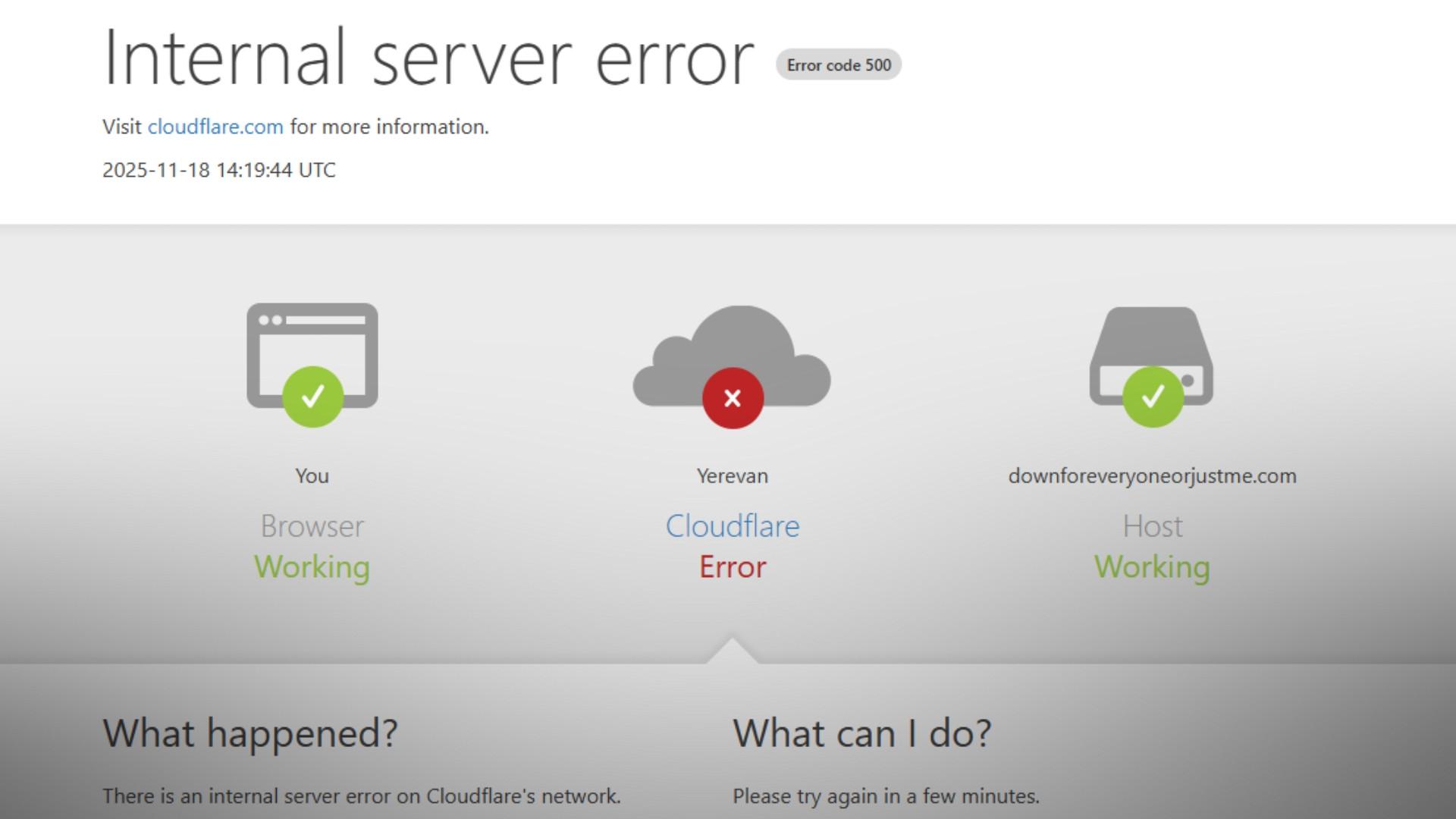 Երևանի ժամանակով 15:48-ից աշխարհի տարբեր երկրներում Cloudflare համակարգի լայնամասշտաբ խափանումներ են նկատվել, ինչի հետևանքով համացանցի մի մասն անհասանելի է դարձել։
