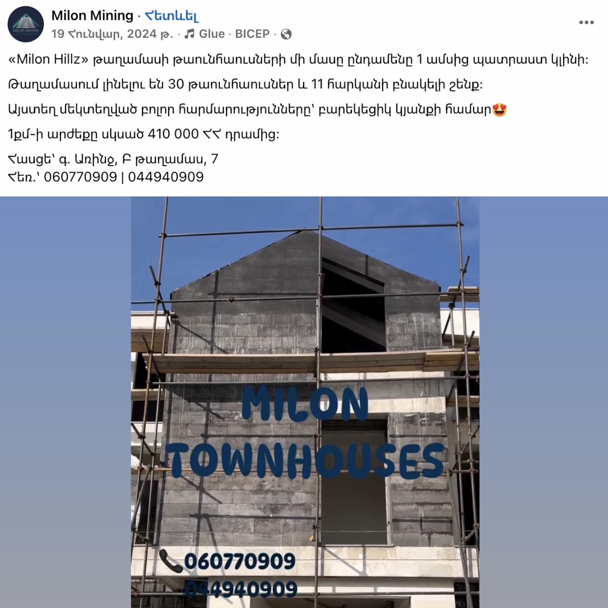 «Միլոն մայնինգ» ՍՊԸ-ի ֆեյսբուքյան էջում նշված է, որ բնակելի տների 1 քմ-ն վաճառվում է սկսած 420 հազար դրամից։