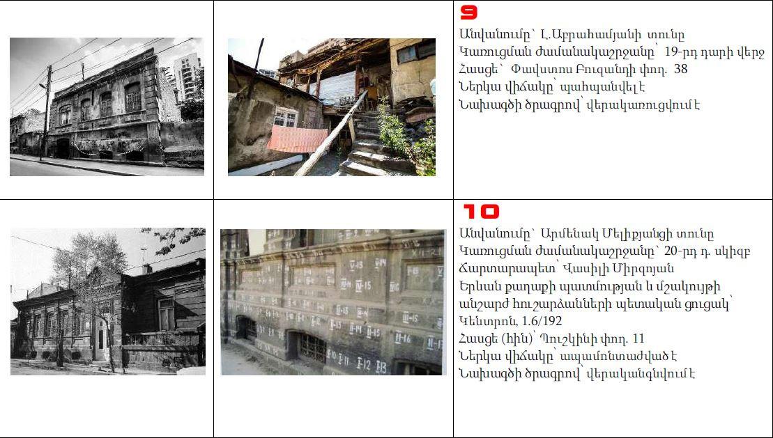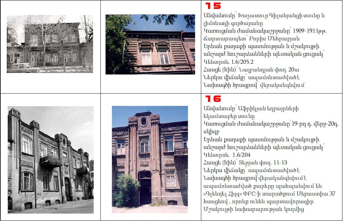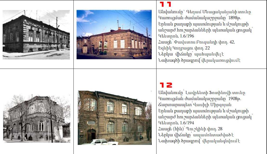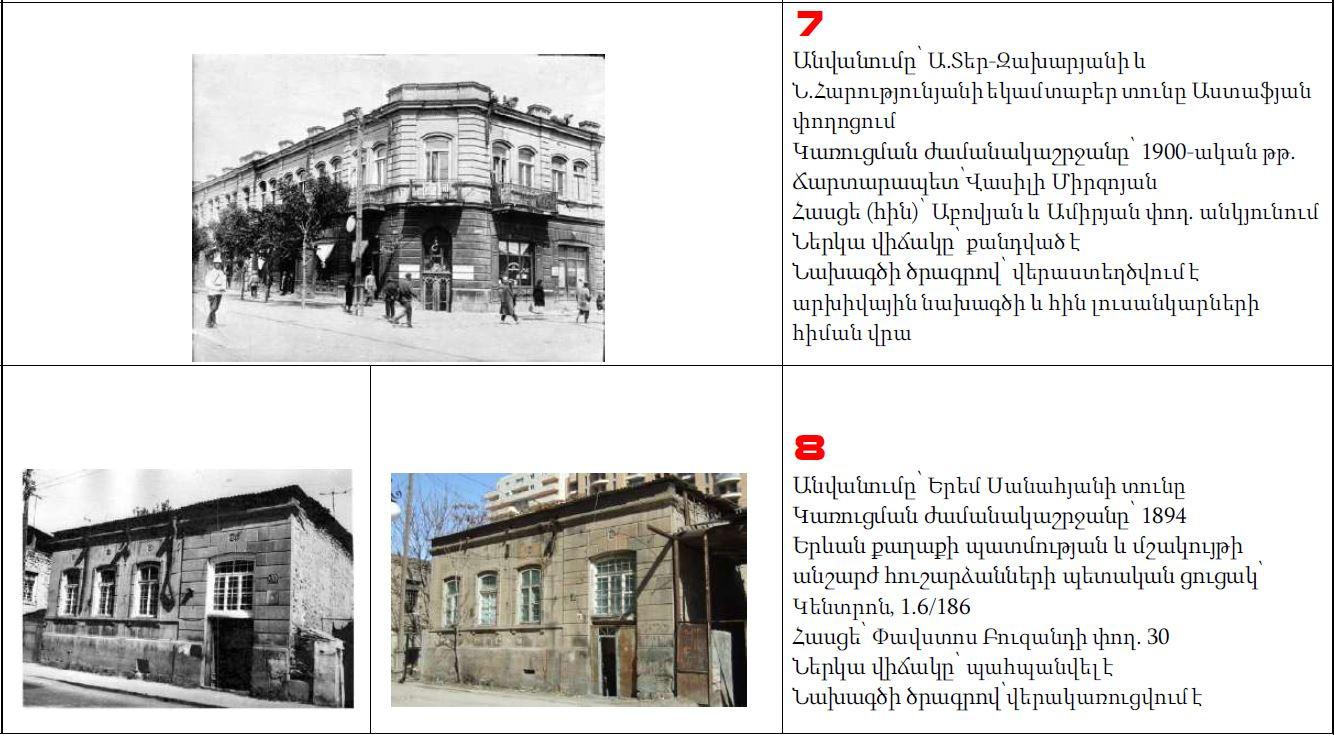 Նախագծի հեղինակ, ճարտարապետ Լևոն Վարդանյանի խոսքով, 7-ը կանգուն է և գտնվում է կառուցվելիք թաղամասի տարածքում, 14-ը` տեղափոխված: